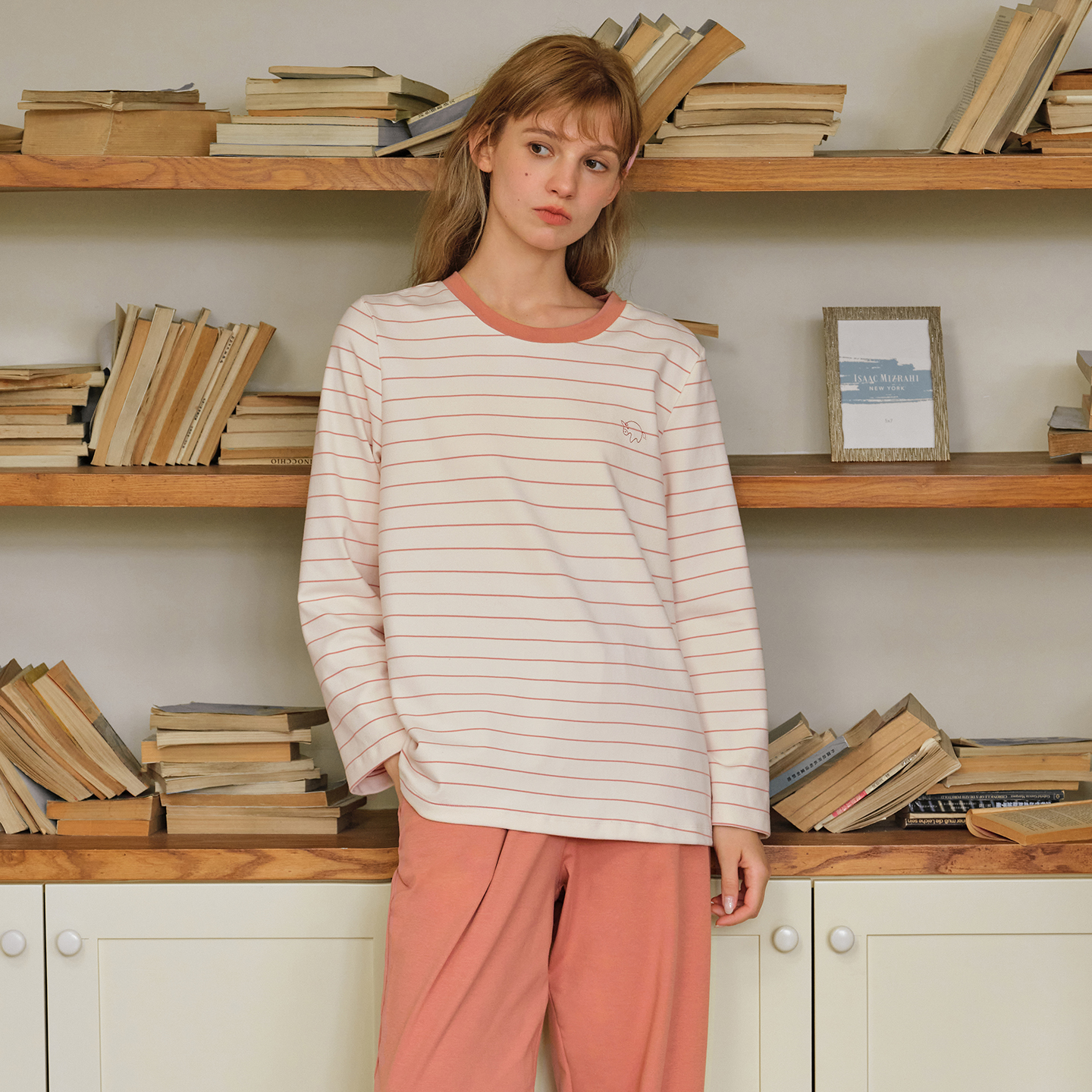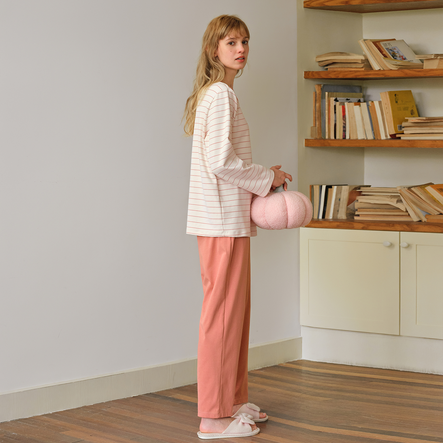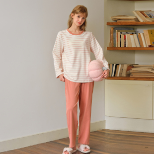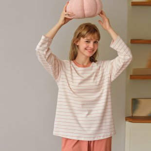 纯棉睡衣女士休闲简约条纹柔软针织棉家居服套装 美标秋冬新款 长袖