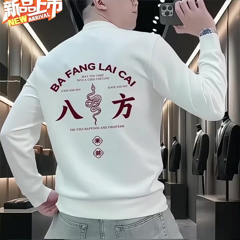 新款 打底衫 时尚 青年长袖 潮流八方来财印花圆领卫衣男士 2025年冬季