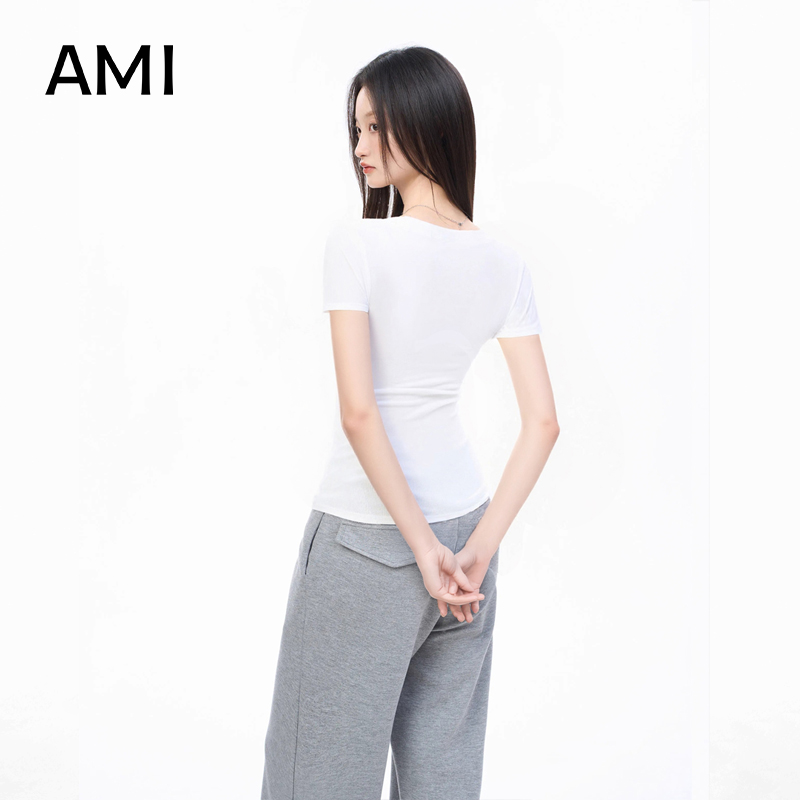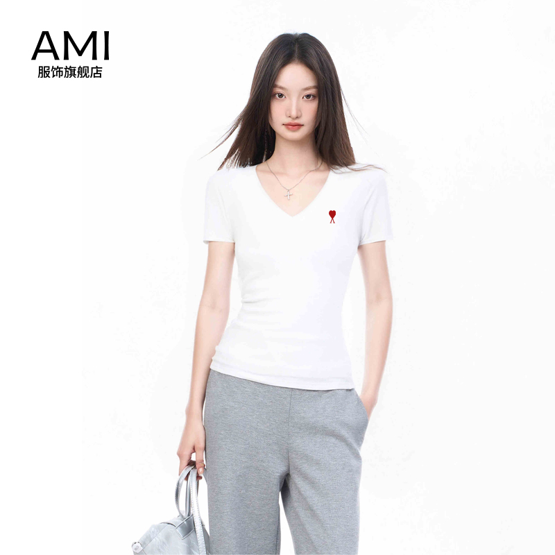 显瘦打底衫 AMI2025美式 修身 t恤女春秋潮牌正品 上衣 白色V领长袖