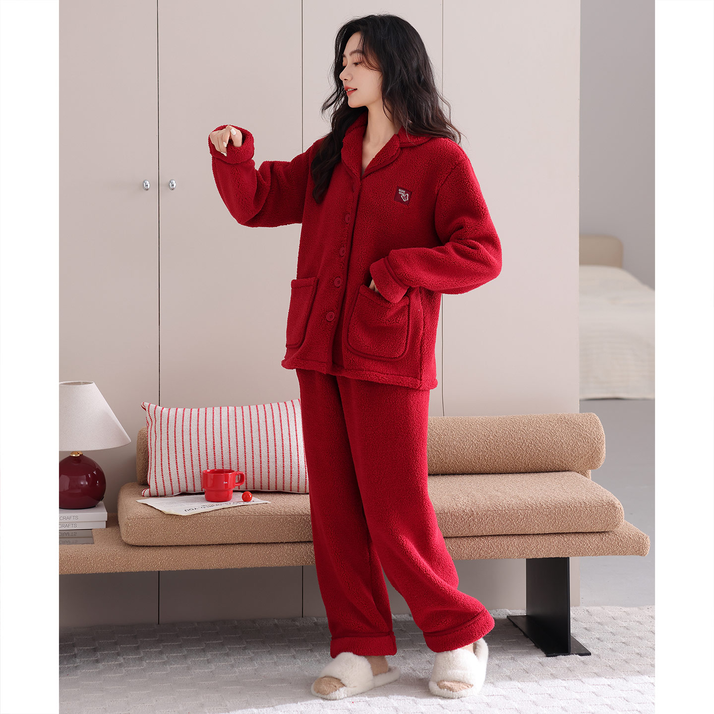 睡衣女秋冬季 珊瑚绒加厚加绒红色新婚本命年新娘结婚法兰绒家居服