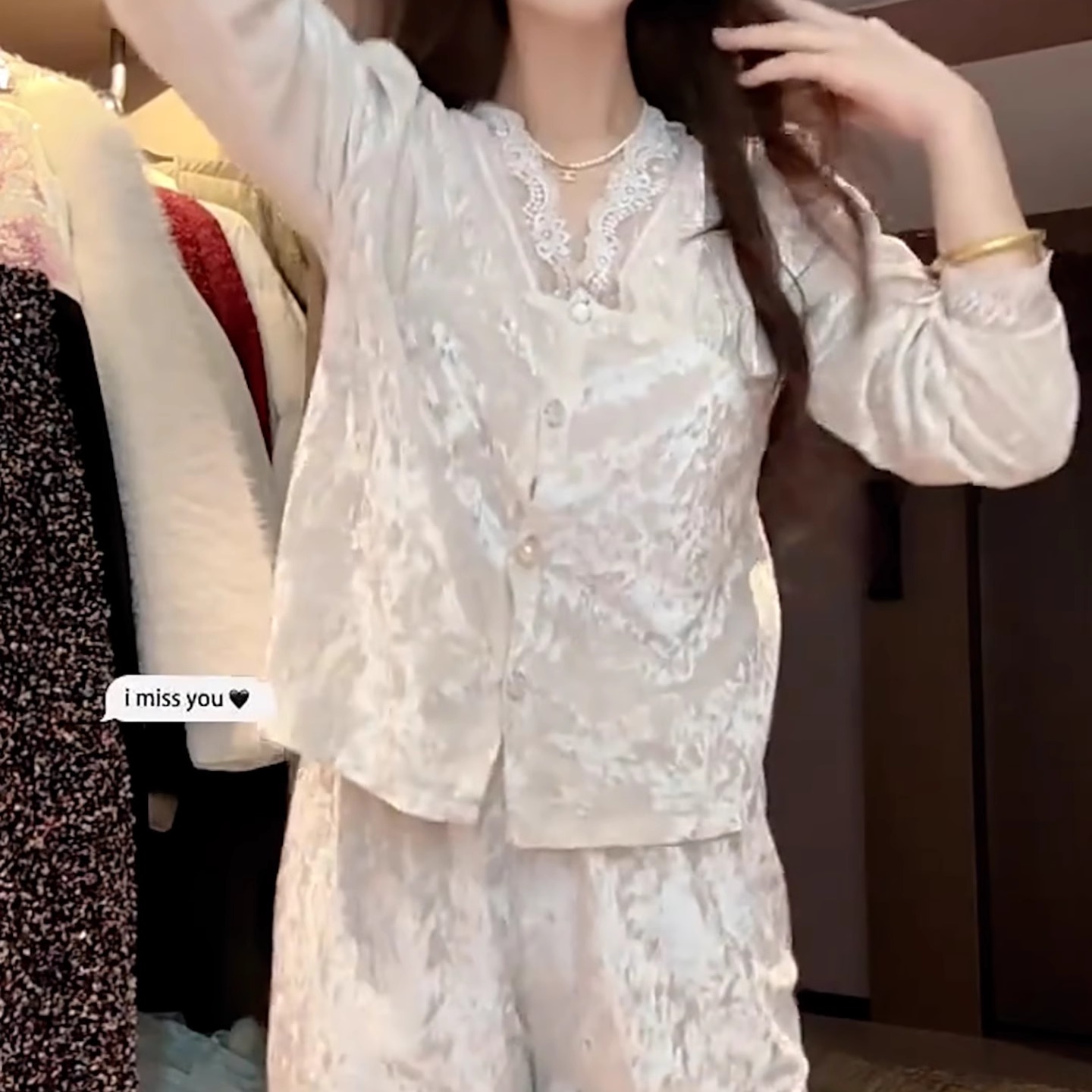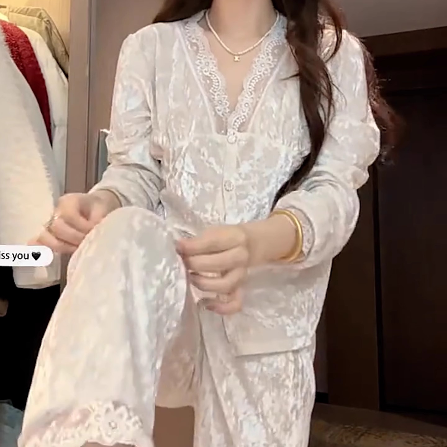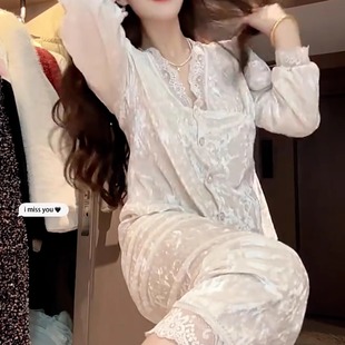 网红款 金钻绒轻奢长袖 时尚 秋冬季 可外穿蕾丝花边家居服女 睡衣套装