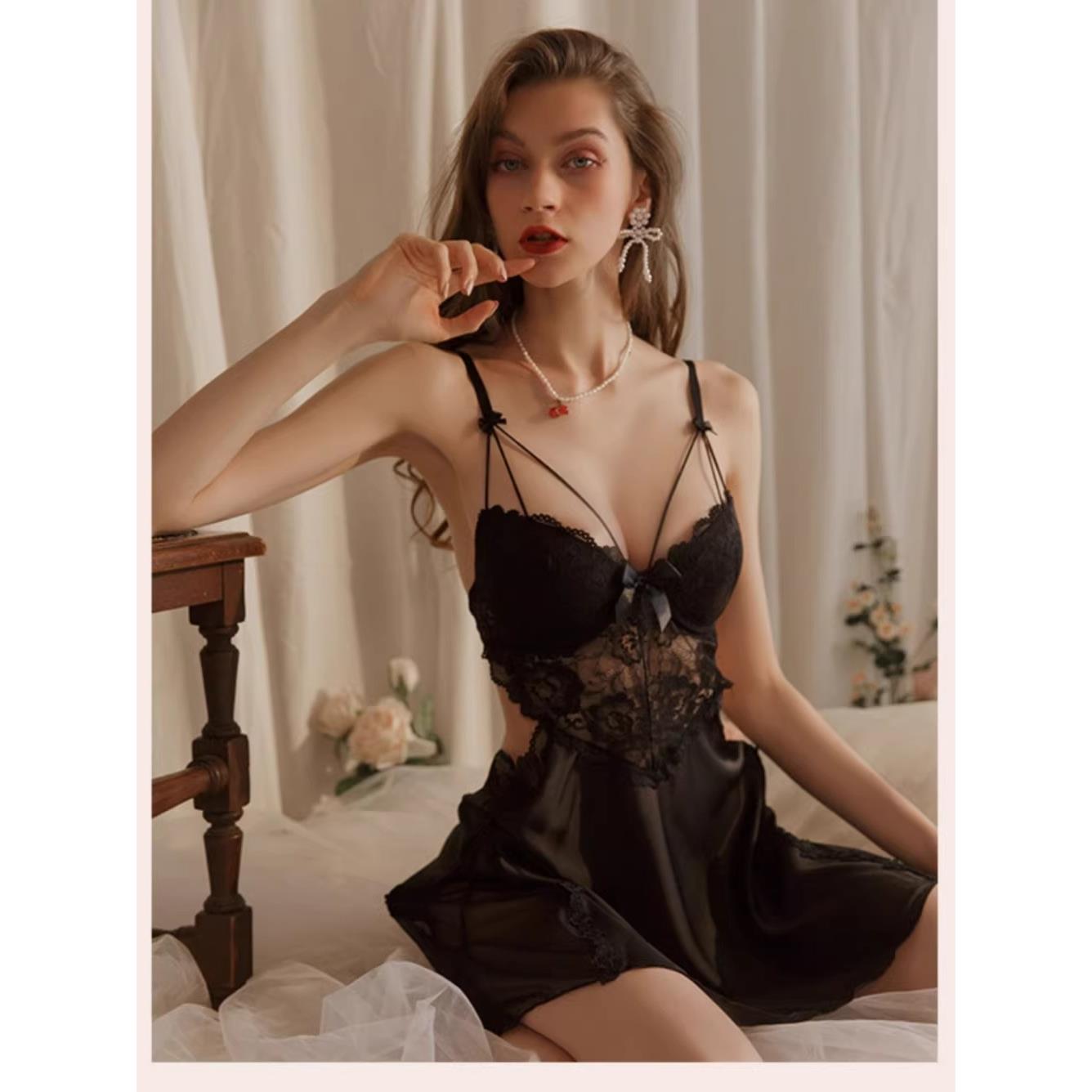 性感睡衣女2025年春夏季 纯欲风冰丝绸带胸垫蕾丝吊带睡裙睡袍 新款
