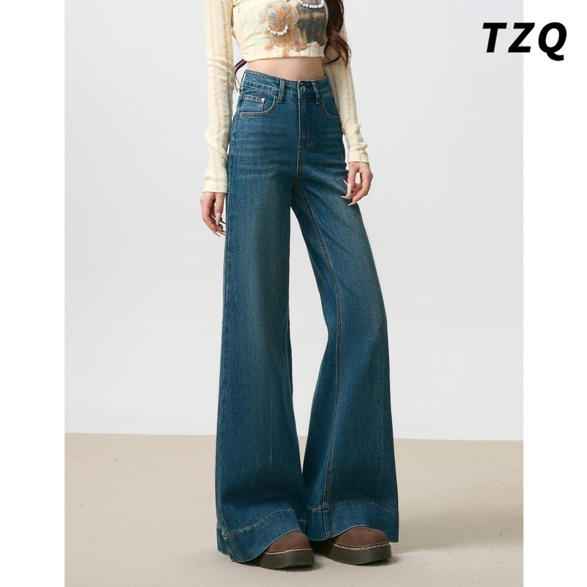 高腰设计感宽松显瘦不贴腿拖地喇叭裤 新款 女秋季 复古蓝微喇牛仔裤
