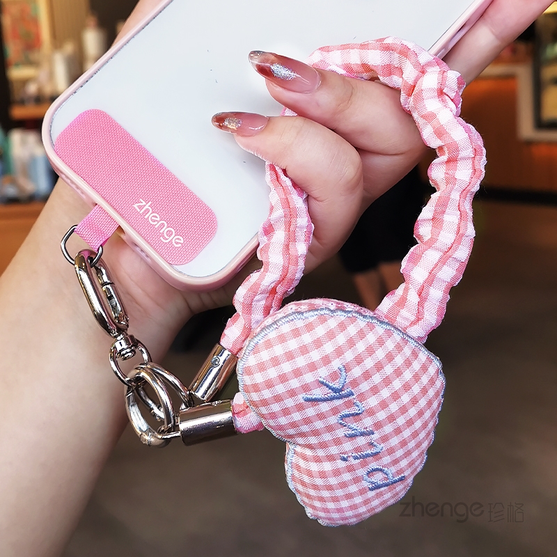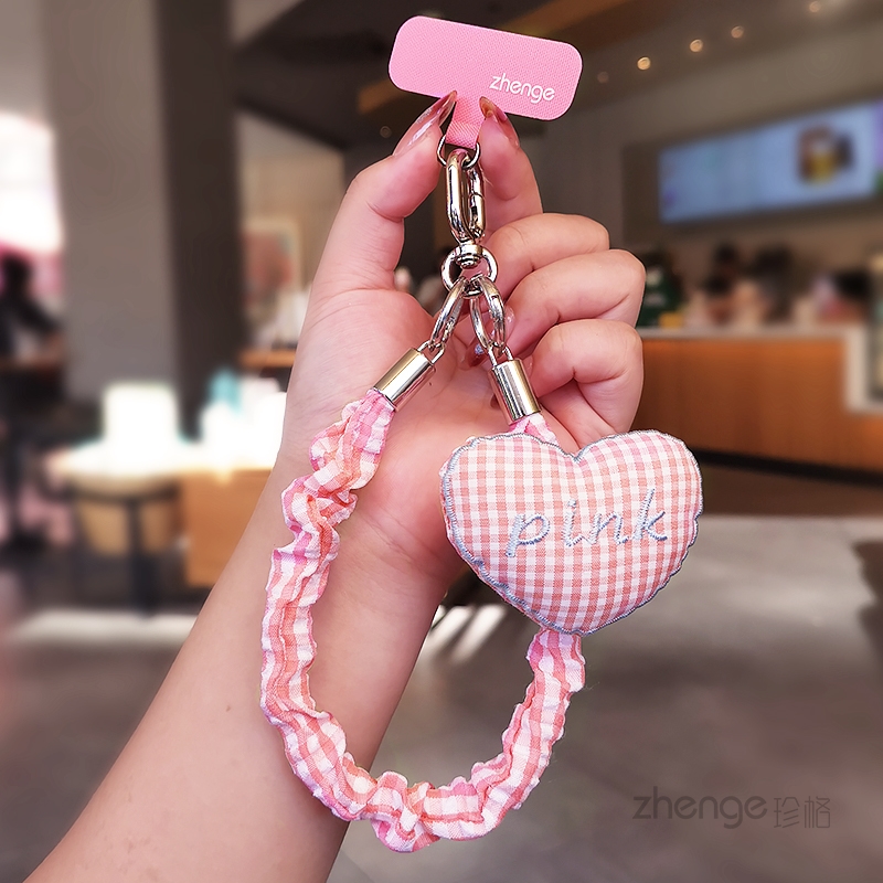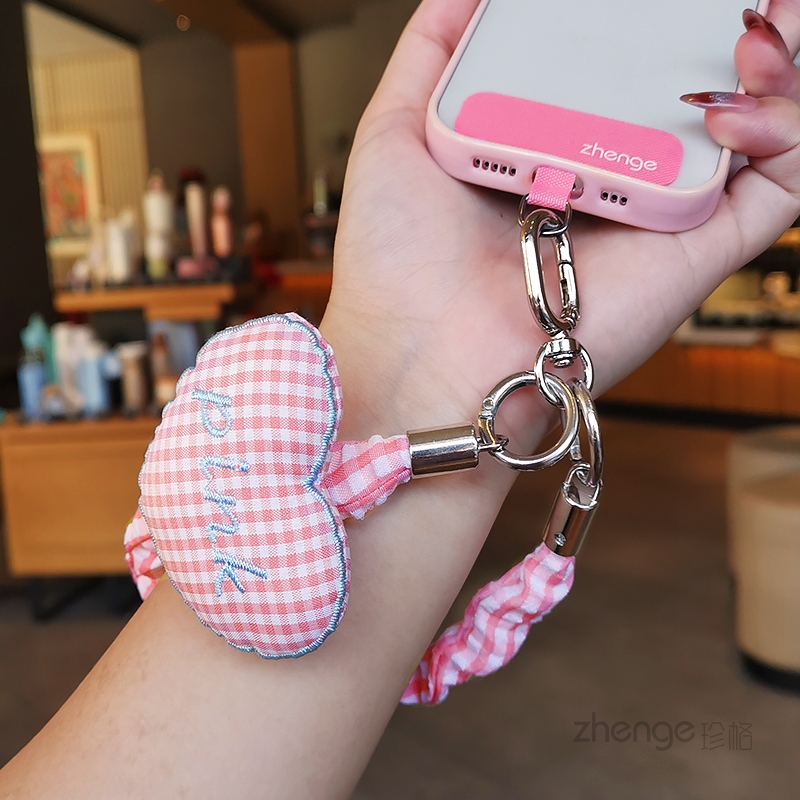 女士百搭新品 手机挂绳手腕式 户外登山旅游行逛街防丢手提链带子电话套吊绳时尚 格子布爱心挂件秋冬季 短款