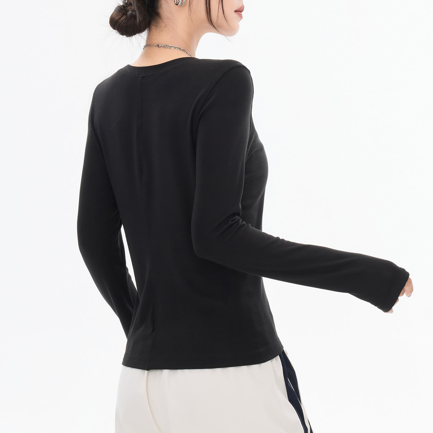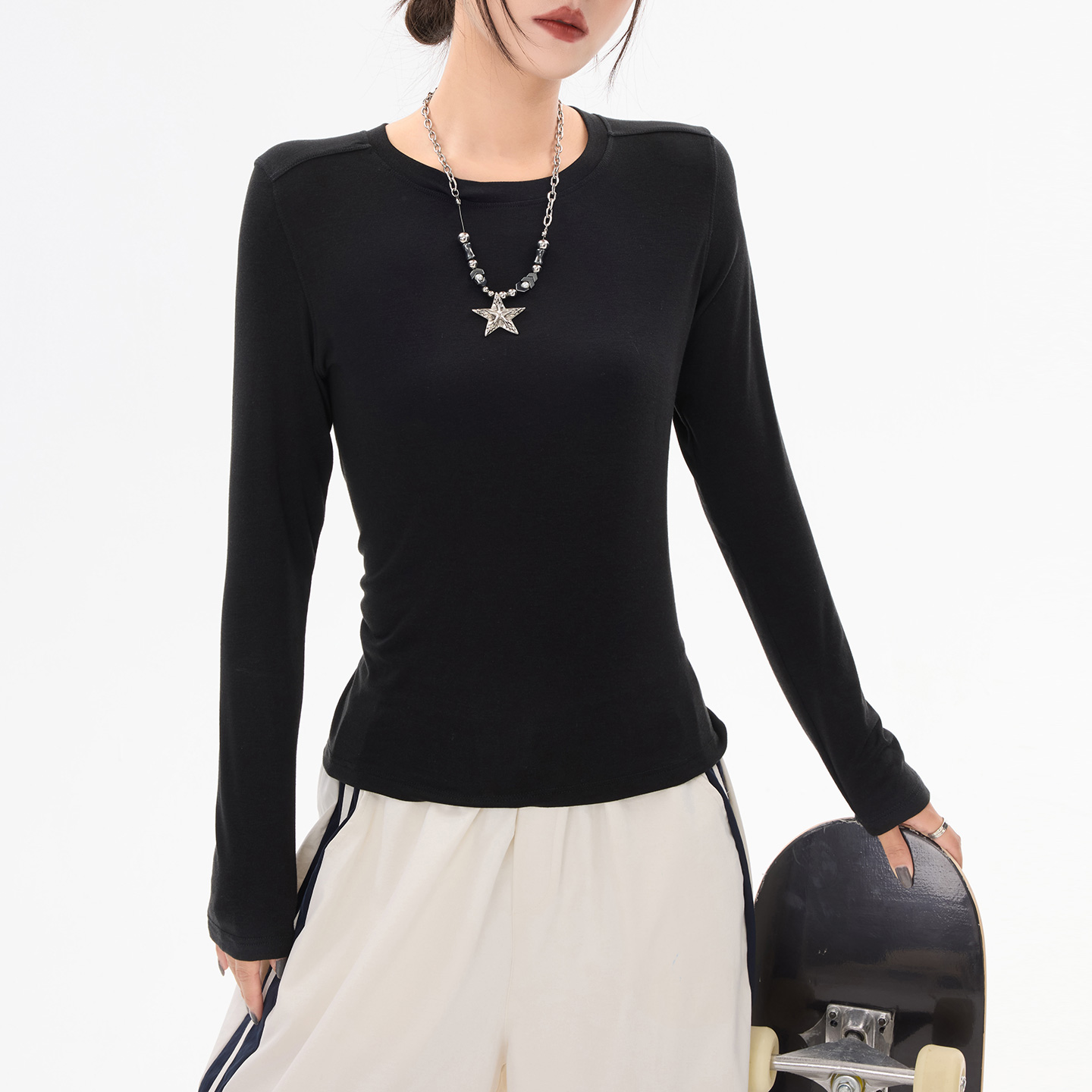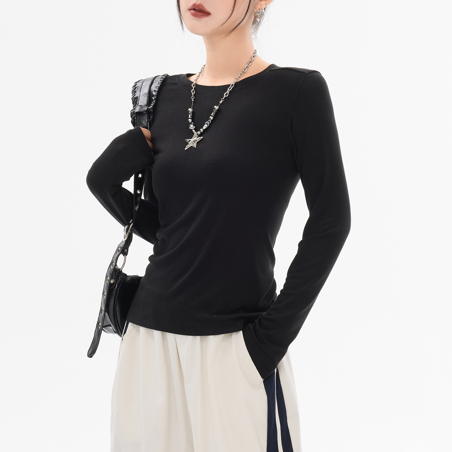 显瘦莱赛尔圆领休闲针织衫 打底衫 修身 黑色长袖 上衣 女2025春秋新款