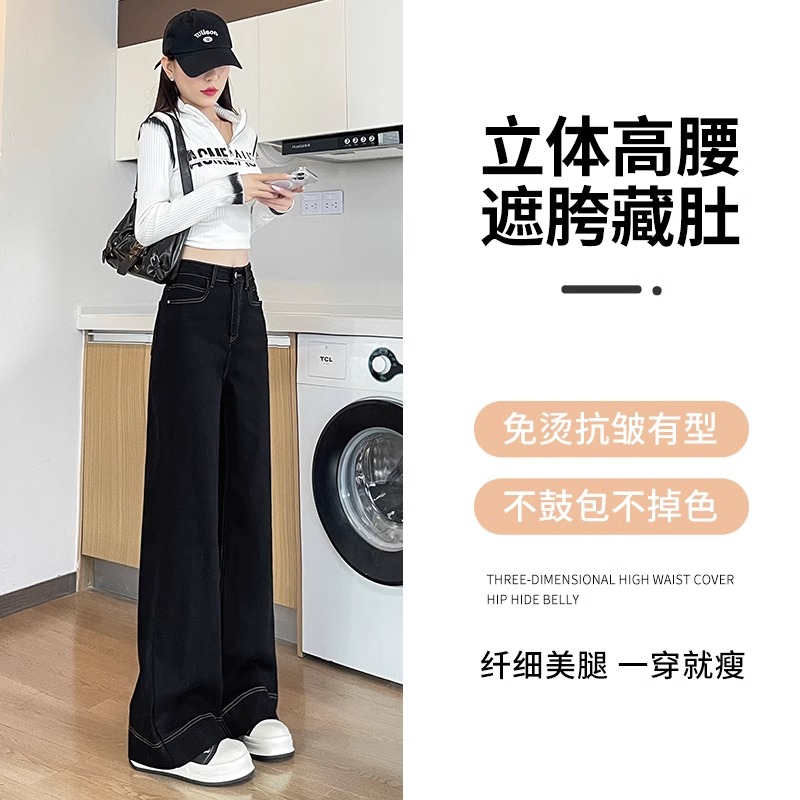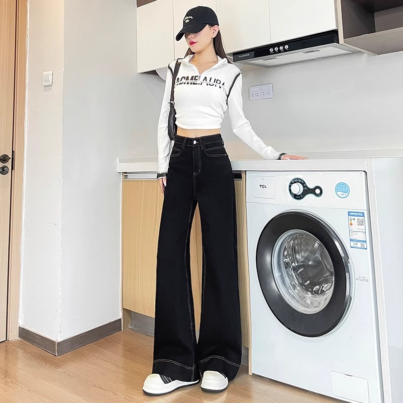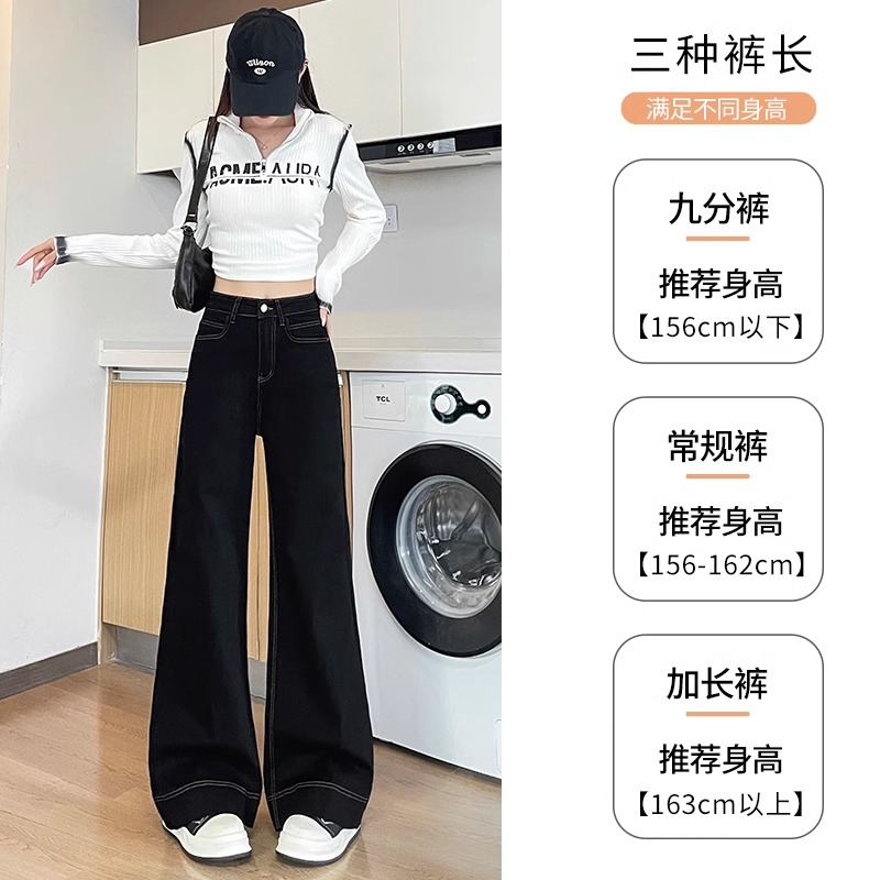 不贴腿喇叭裤 高腰宽松大码 子 女2025年春秋新款 黑色水洗阔腿牛仔裤
