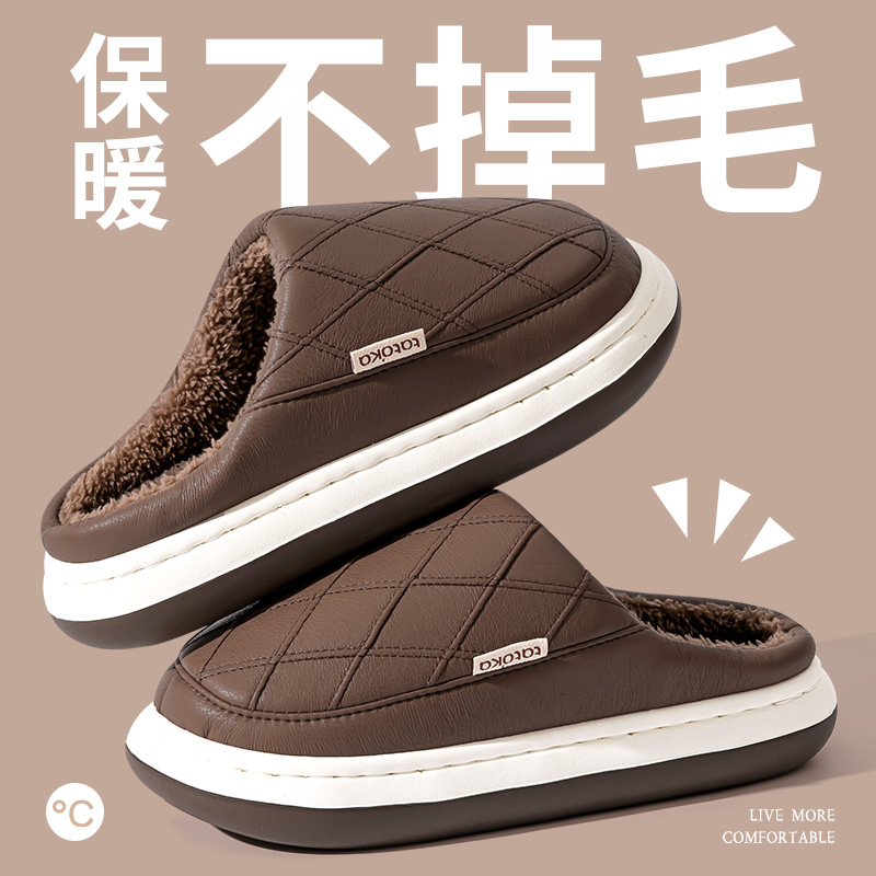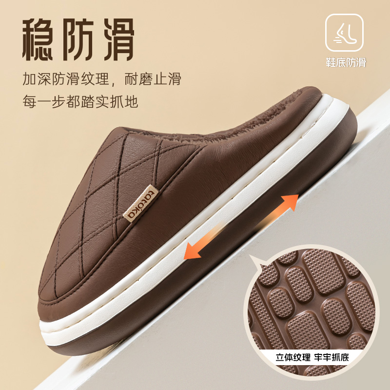 家居室内PU皮面防水厚底加绒棉拖鞋 深咖色多规格