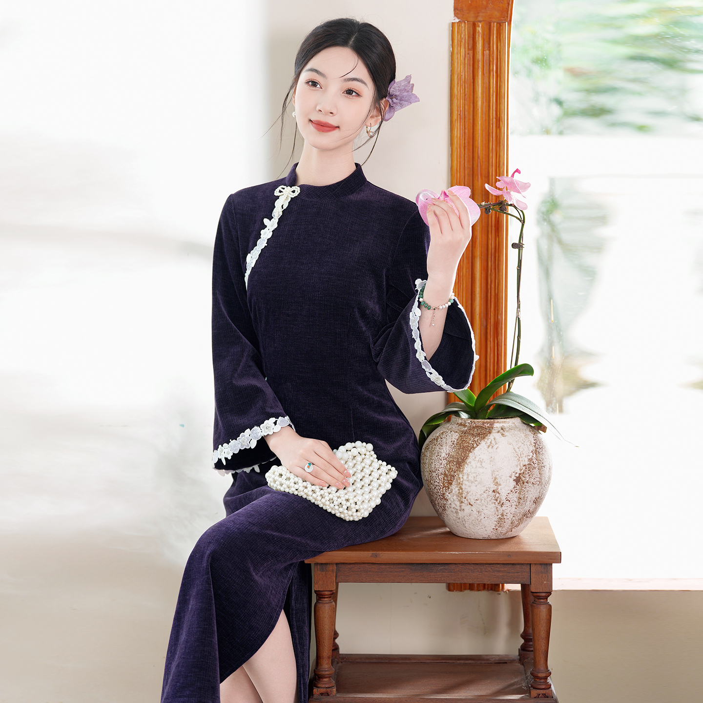 黑色丝绒鱼尾旗袍性感长款 连衣裙女秋 显瘦老上海中国风日常生活装