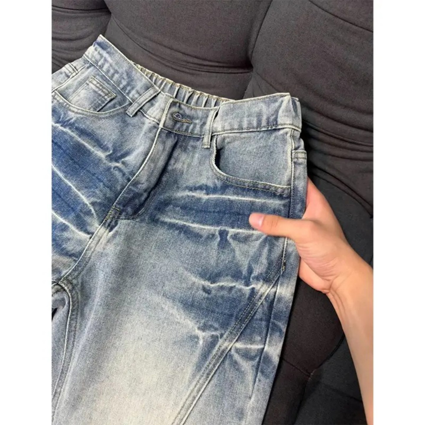 松驰感阔腿牛仔裤 新款 夏 女2025秋季 阔色条纹花边蓝色休闲直筒长裤