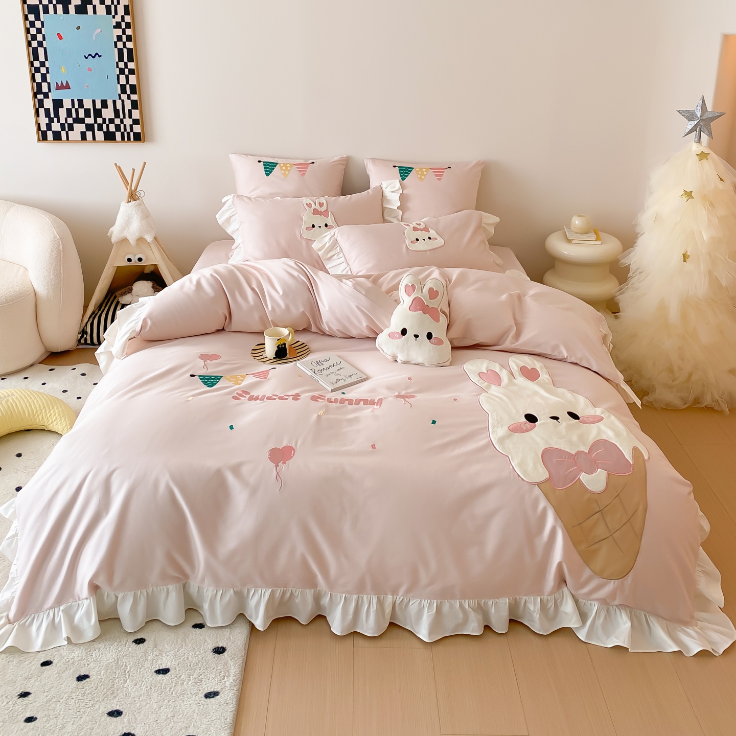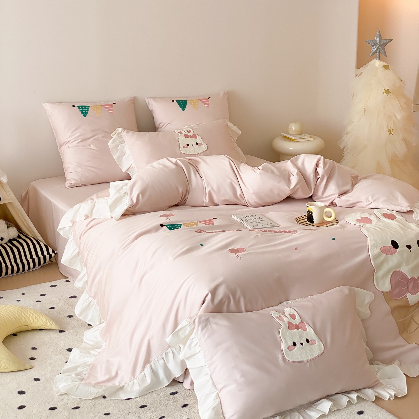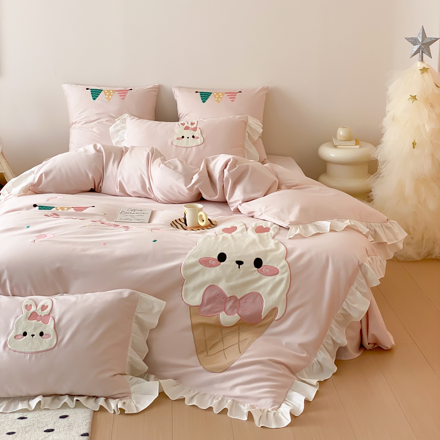 红花车全棉秋冬100S澳棉四件套可爱公主风贴布绣花边女孩被套床单