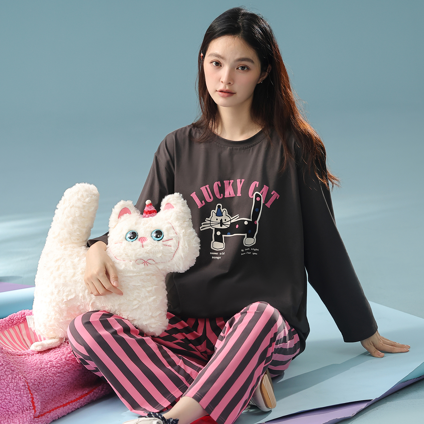 长袖 可外穿家居服套装 长裤 秋天女款 大码 芬腾A类纯棉睡衣女春秋季