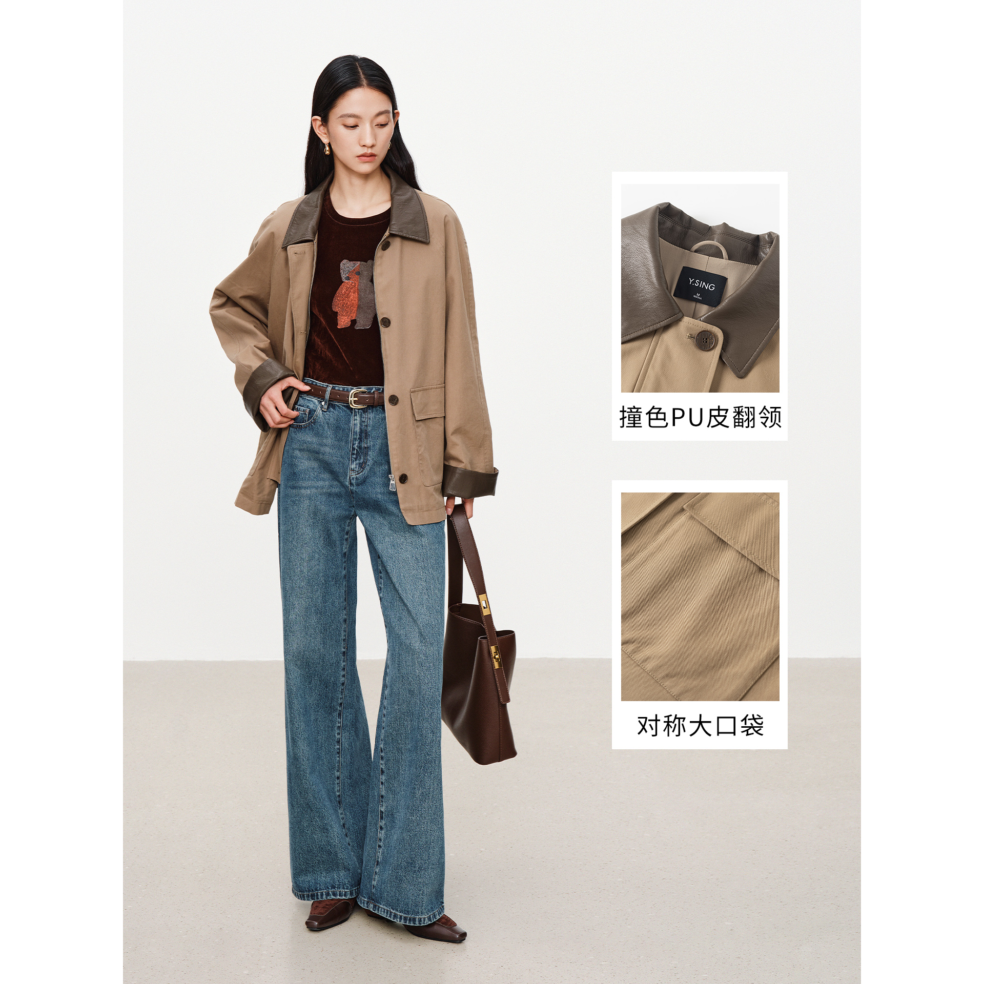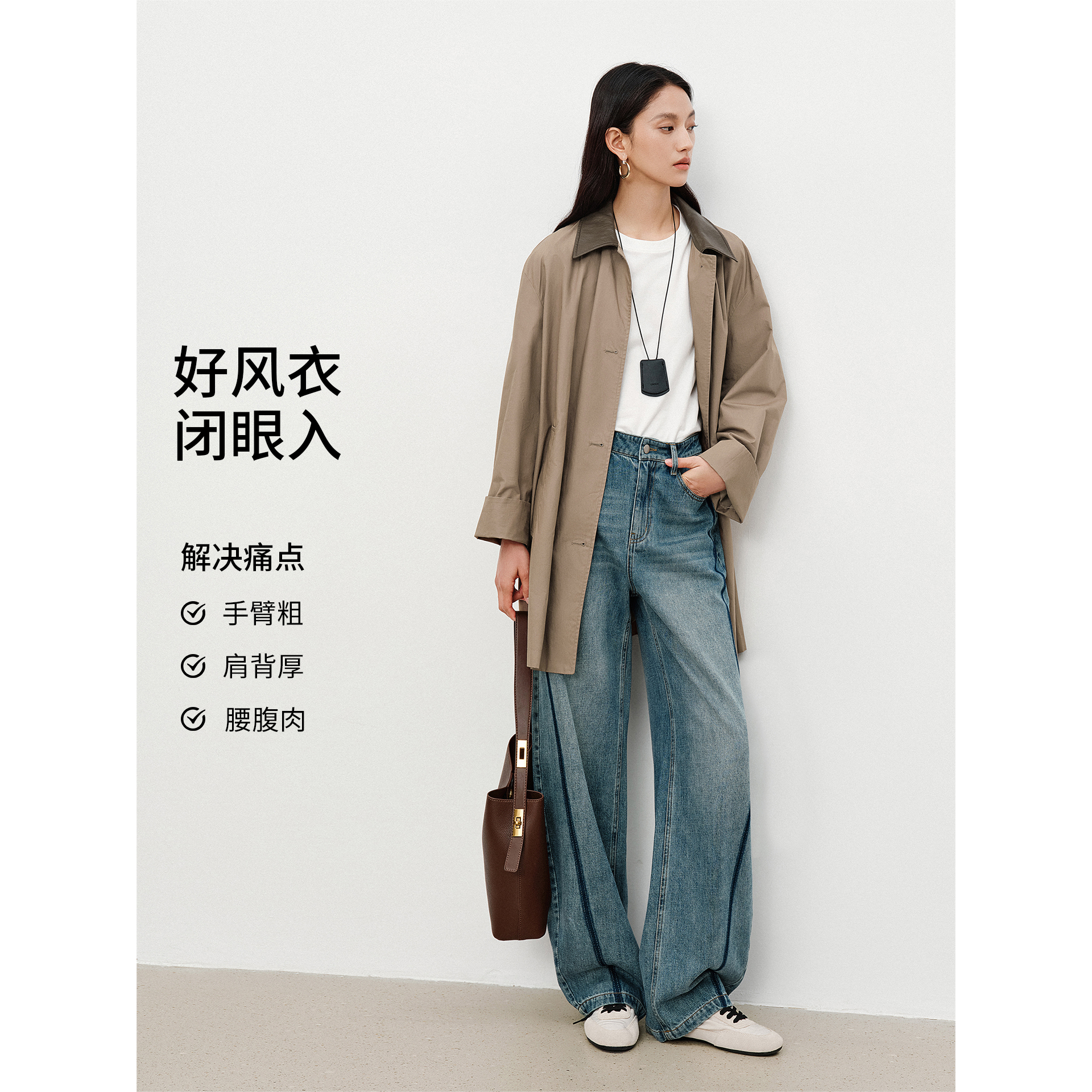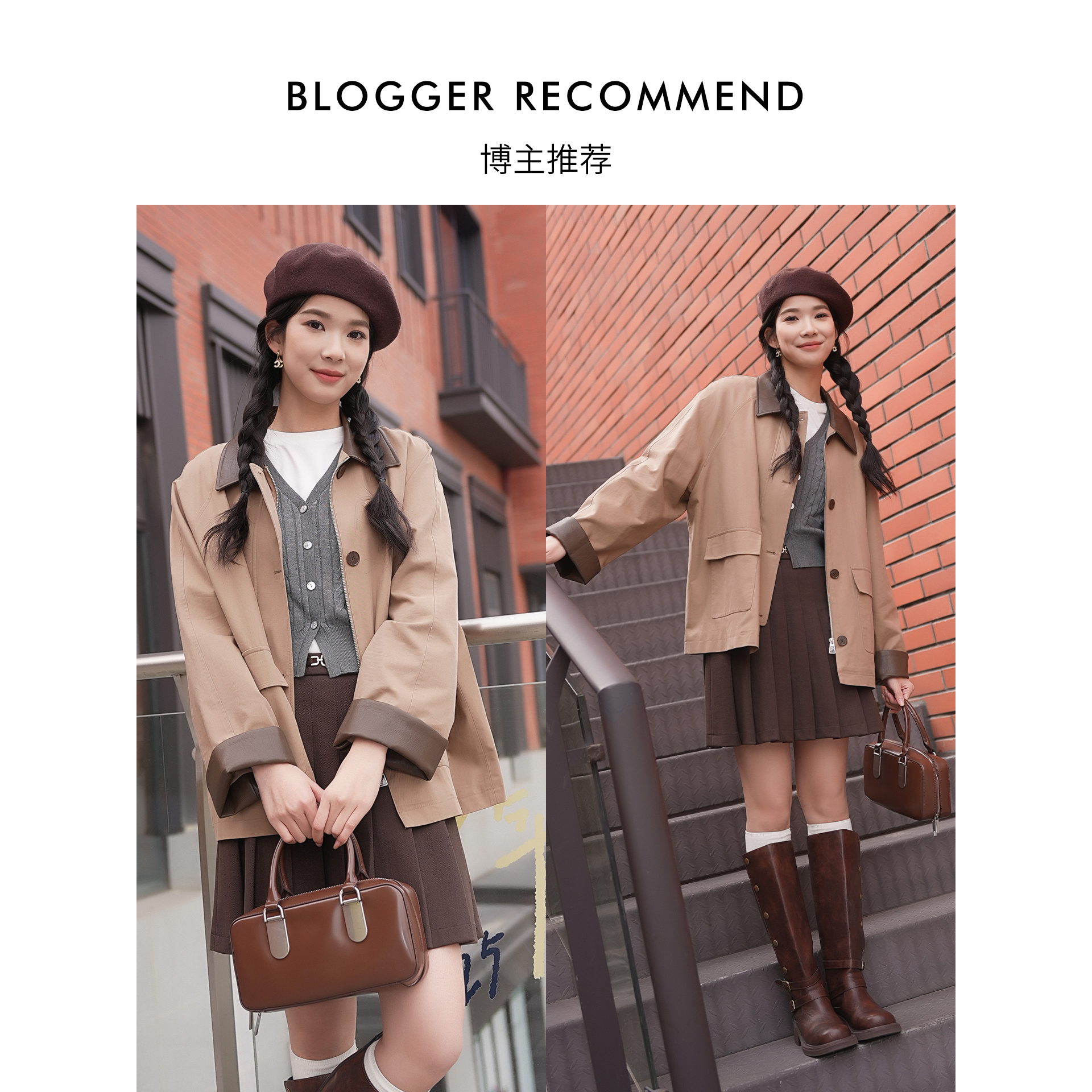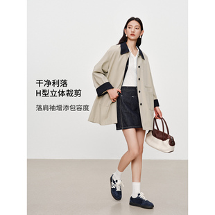 衣香丽影巴恩风撞色短外套女2025年秋装 卡其色翻领天丝棉风衣 新款
