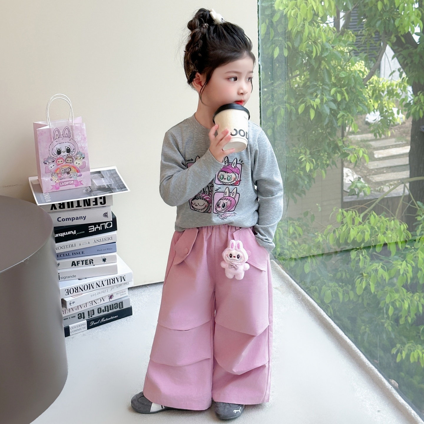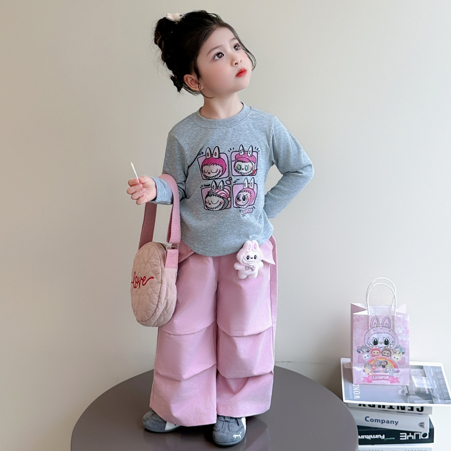 查尔斯桃心学院风领带假两件卫衣小狗套装 男宽松休闲条纹直筒长裤