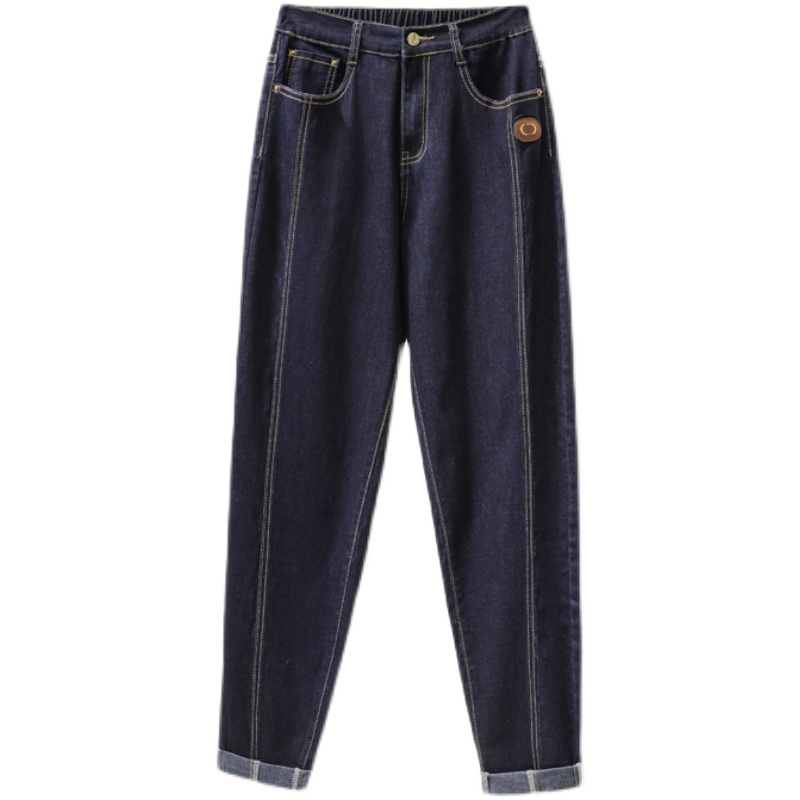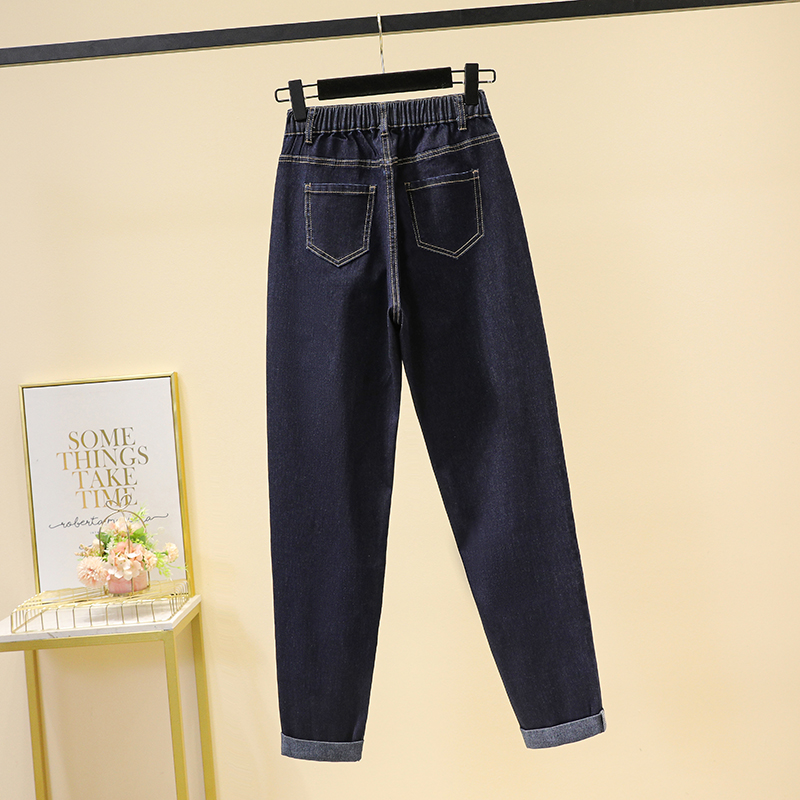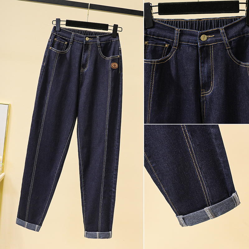 卷边牛仔裤 时尚 胖MM秋新款 高腰宽松老爹裤 大码 弹力显瘦哈伦裤 女装