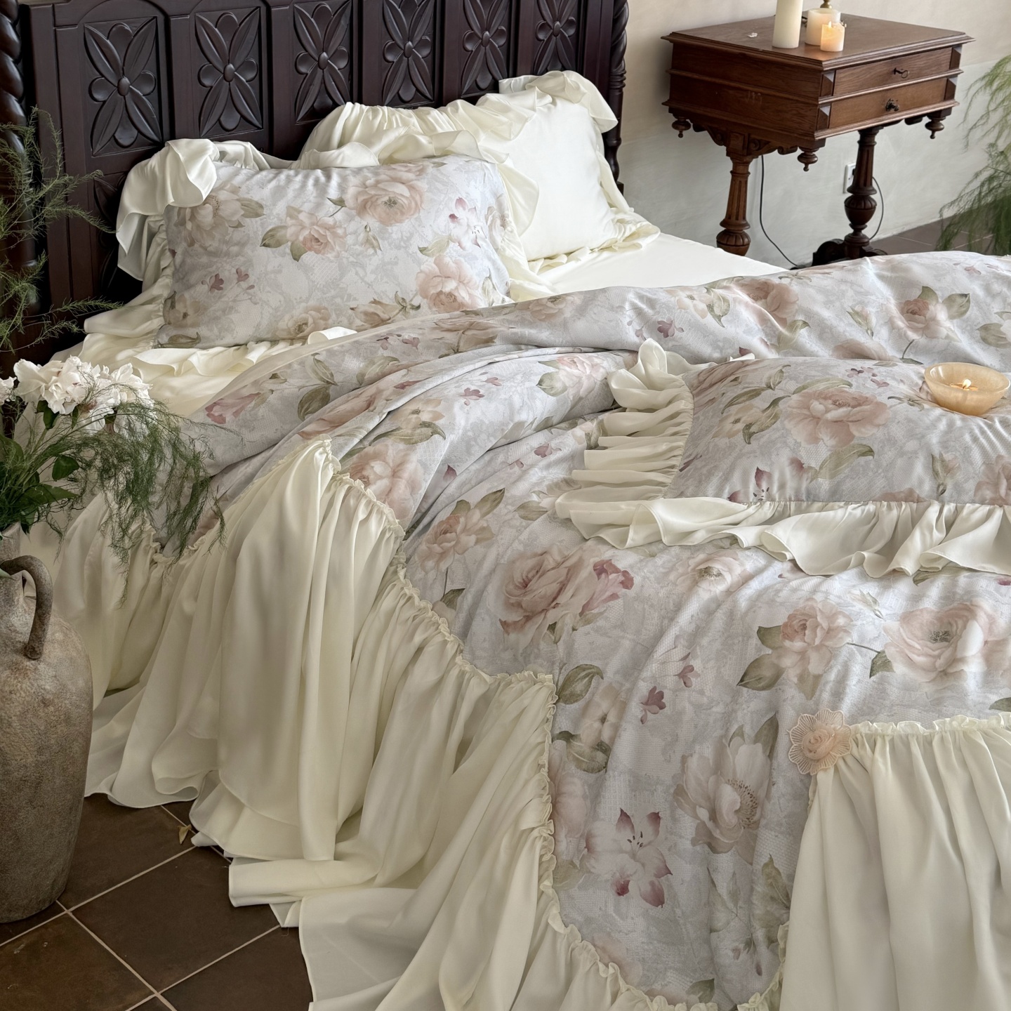 红花车法式 高级感天丝棉印花四件套公主风花边丝滑被套床单床品