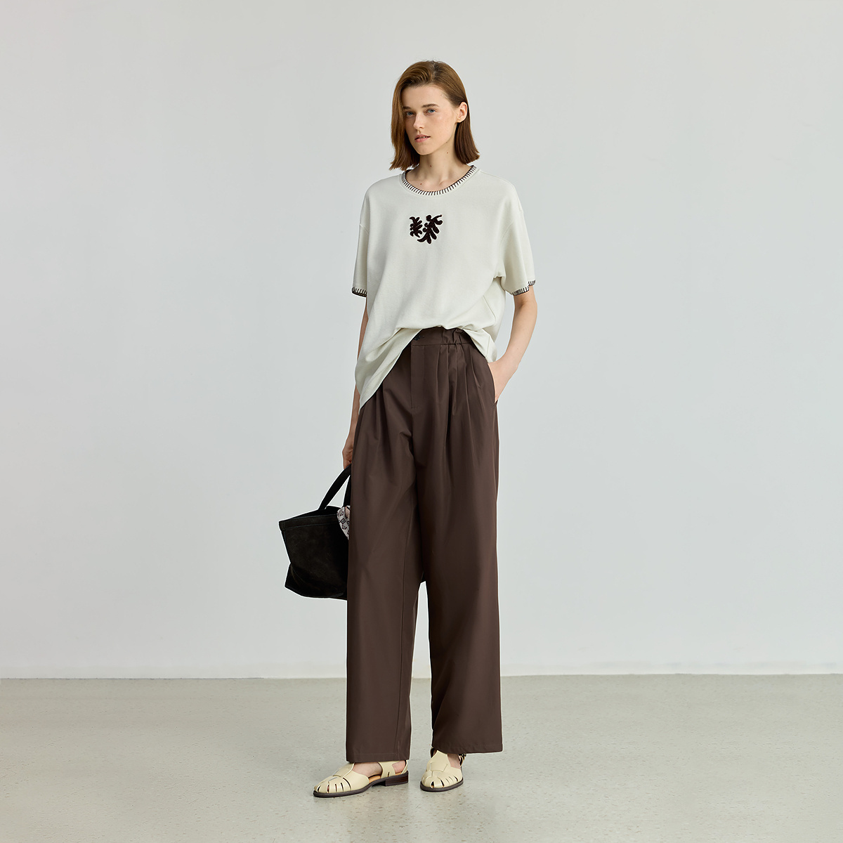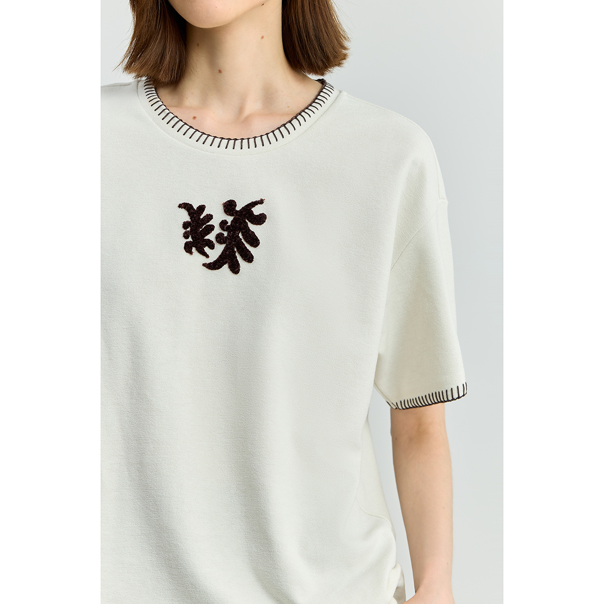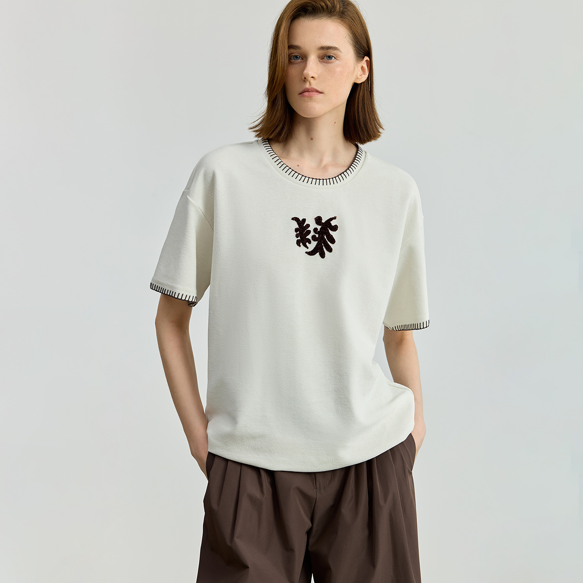 LILY2025秋新款 T恤女上衣 简约撞色线条立体图案休闲落肩圆领短袖