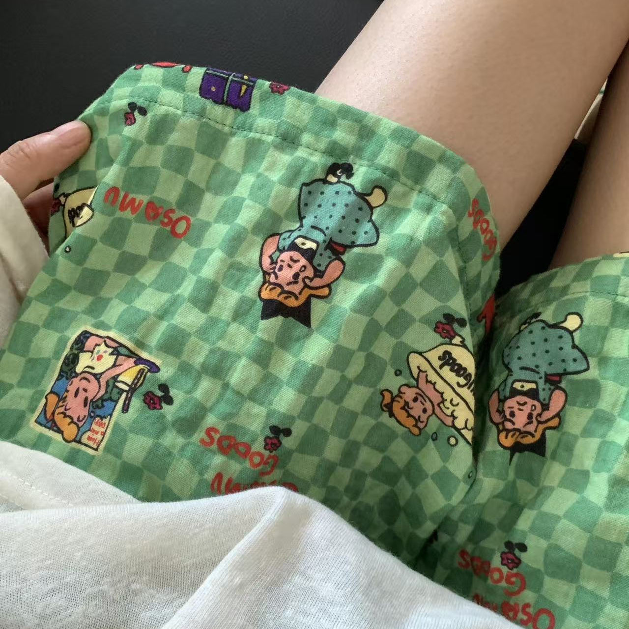 短裤 A类纯棉双层纱绿色可爱女孩印花宽松日系阔腿遛弯家居裤 睡裤