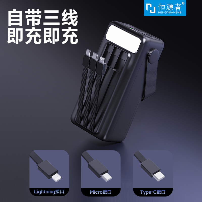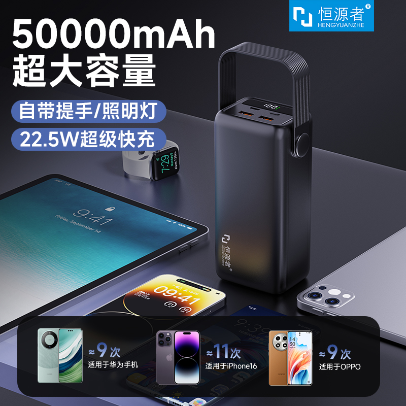 恒源者自带线大容量50000毫安充电宝22.5W双向超级快充带LED照明灯户外直播露营钓鱼学生宿舍摆摊移动电源346