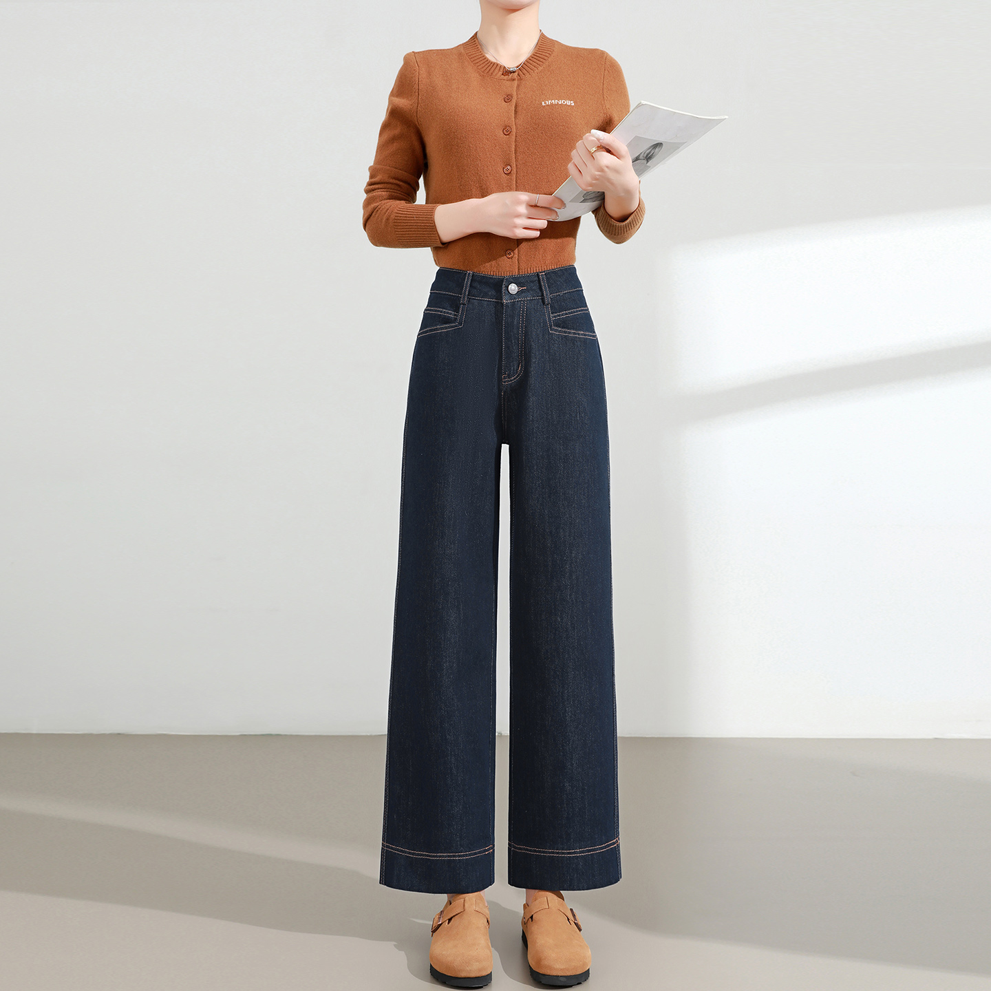 子 高腰显瘦百搭九分阔腿裤 丹宁蓝加绒直筒牛仔裤 女小个子秋冬新款