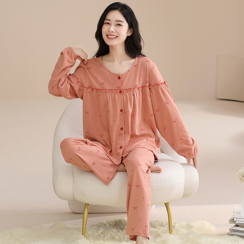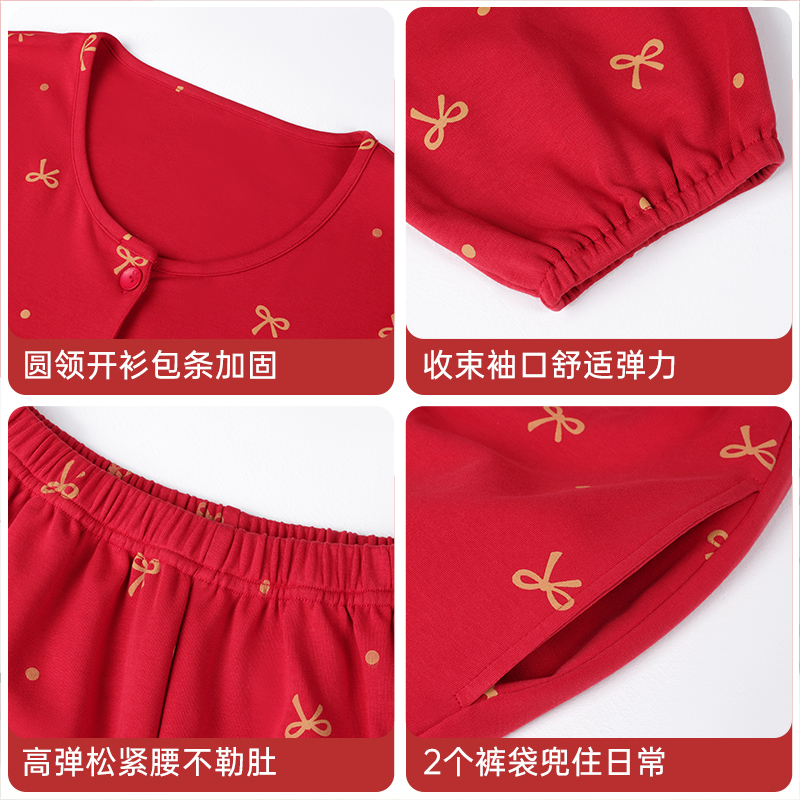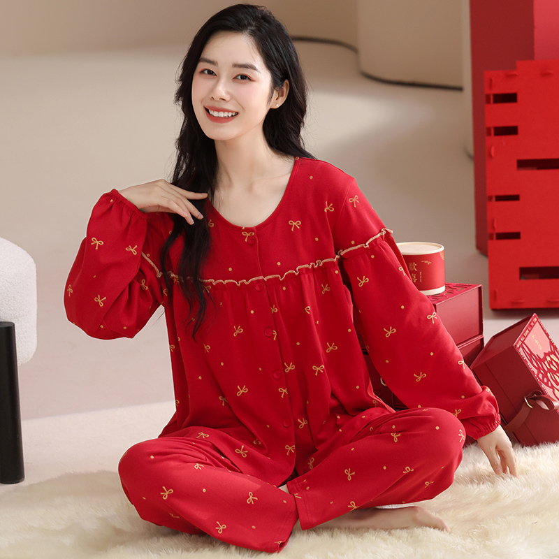 新款 大码 结婚本命年长袖 套装 女士家居服 长裤 玛伦萨纯棉睡衣女秋季