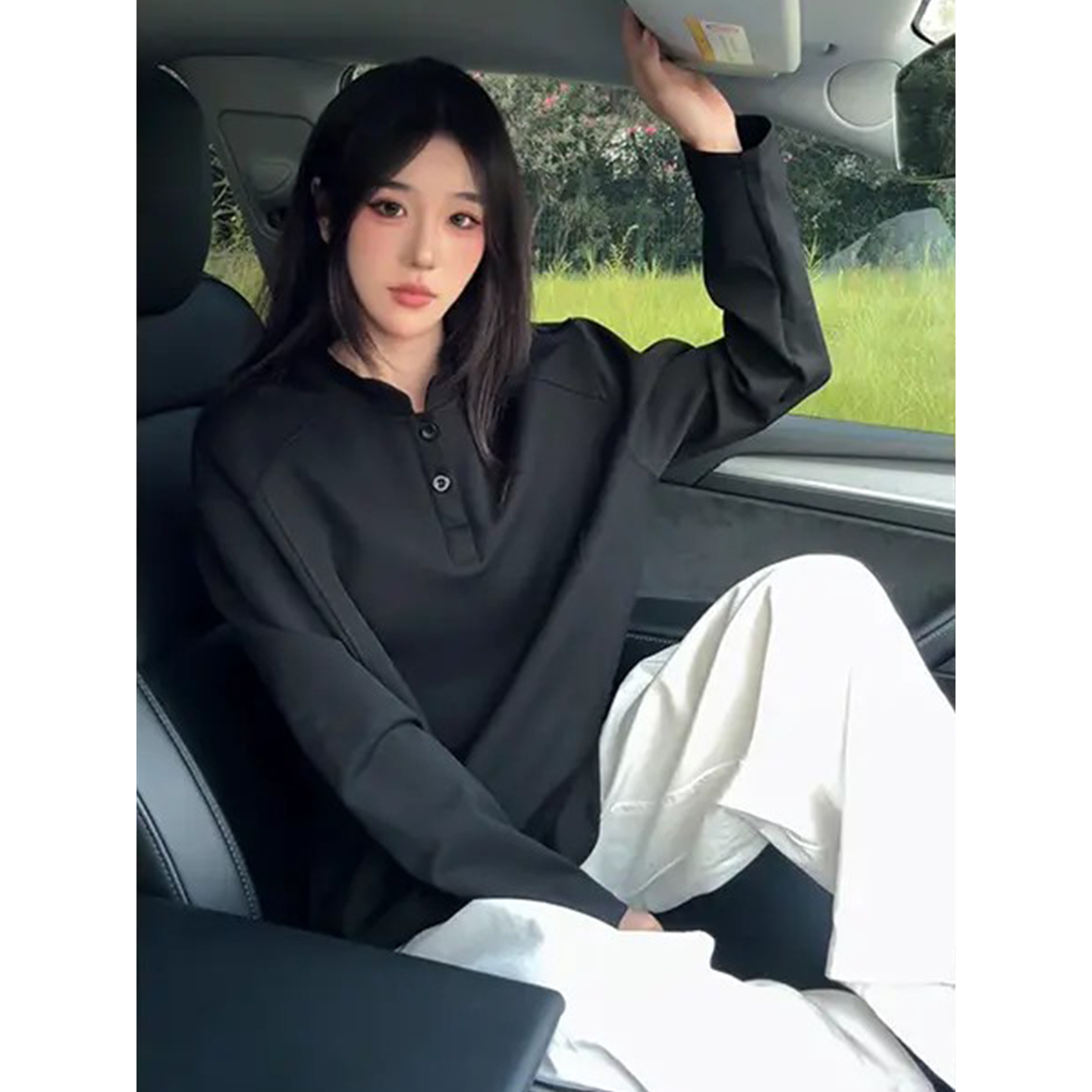 美式 t恤男生早秋穿搭上衣重磅正肩情侣内搭卫衣 街头风亨利领长袖