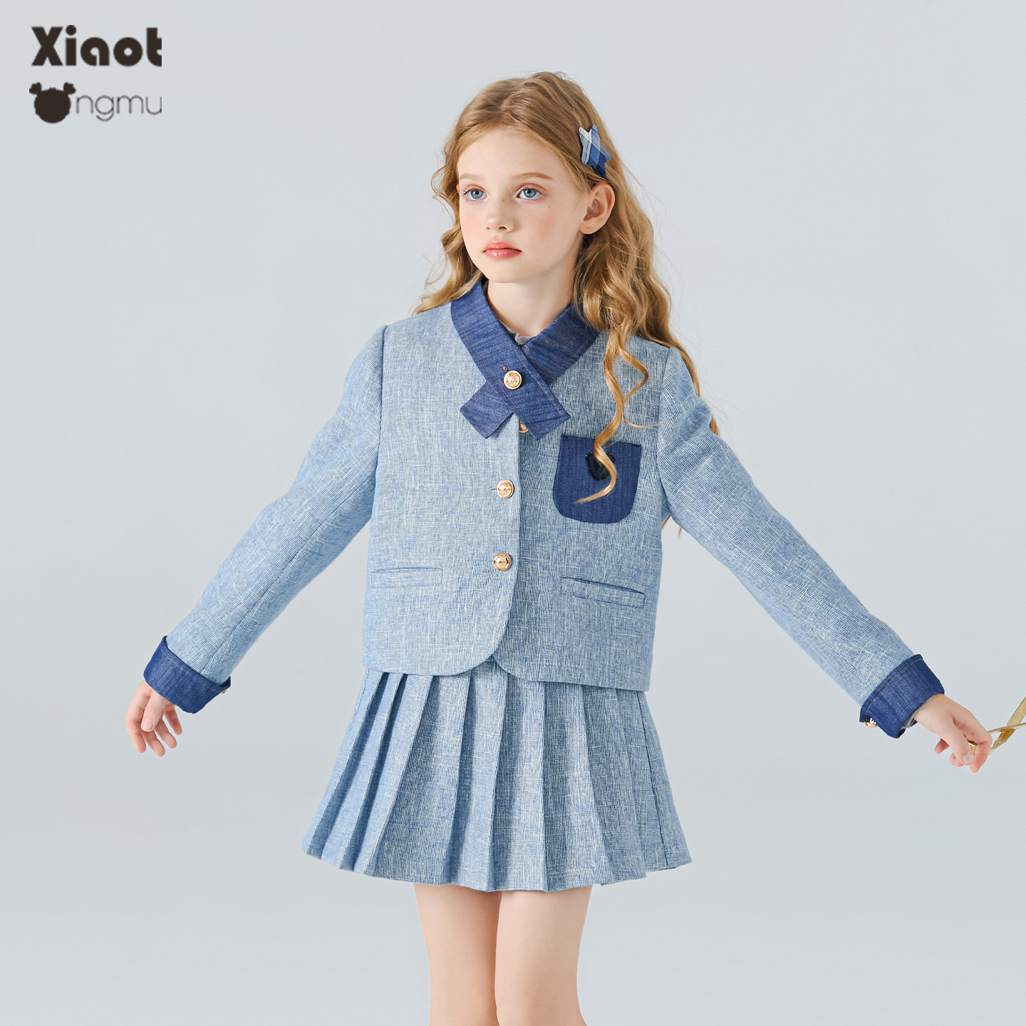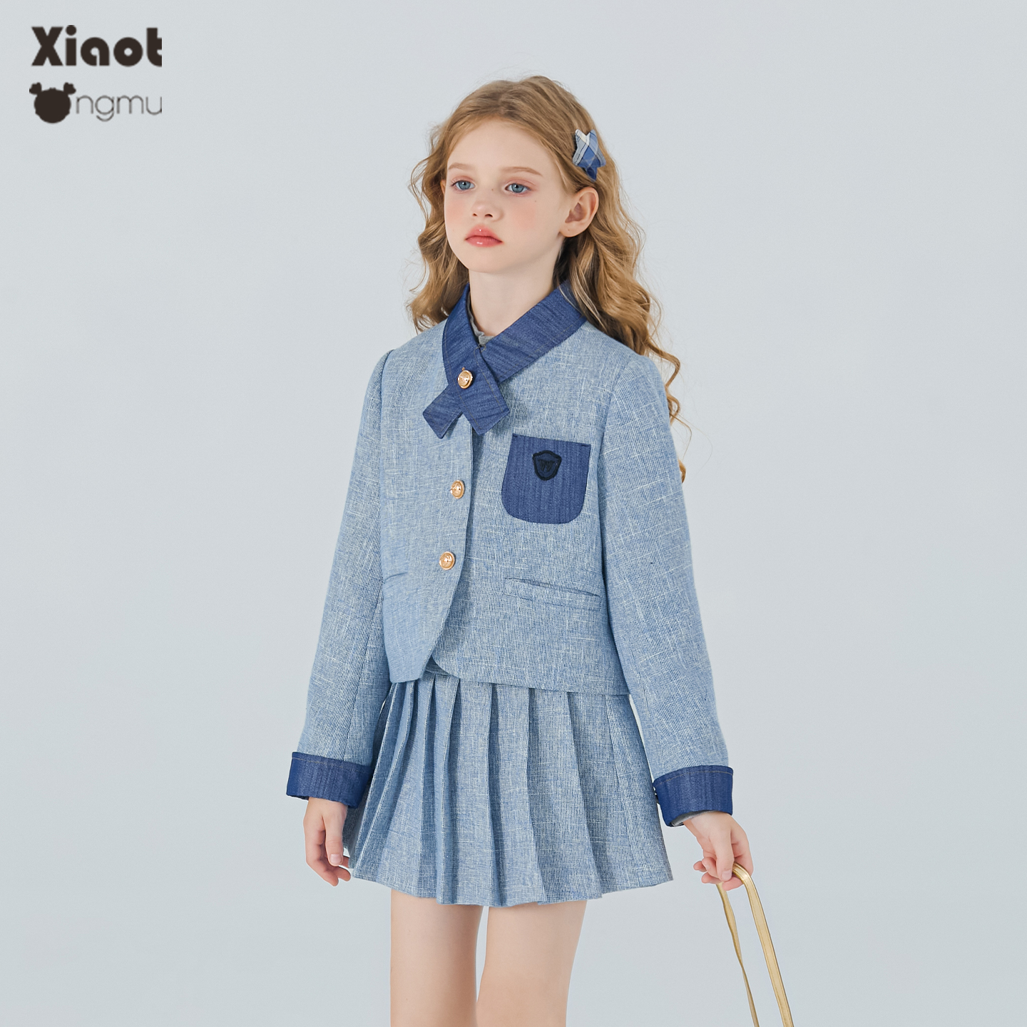 2025新款 秋装 中大童外套百褶裙 英伦学院感女童小香风套装 小童木