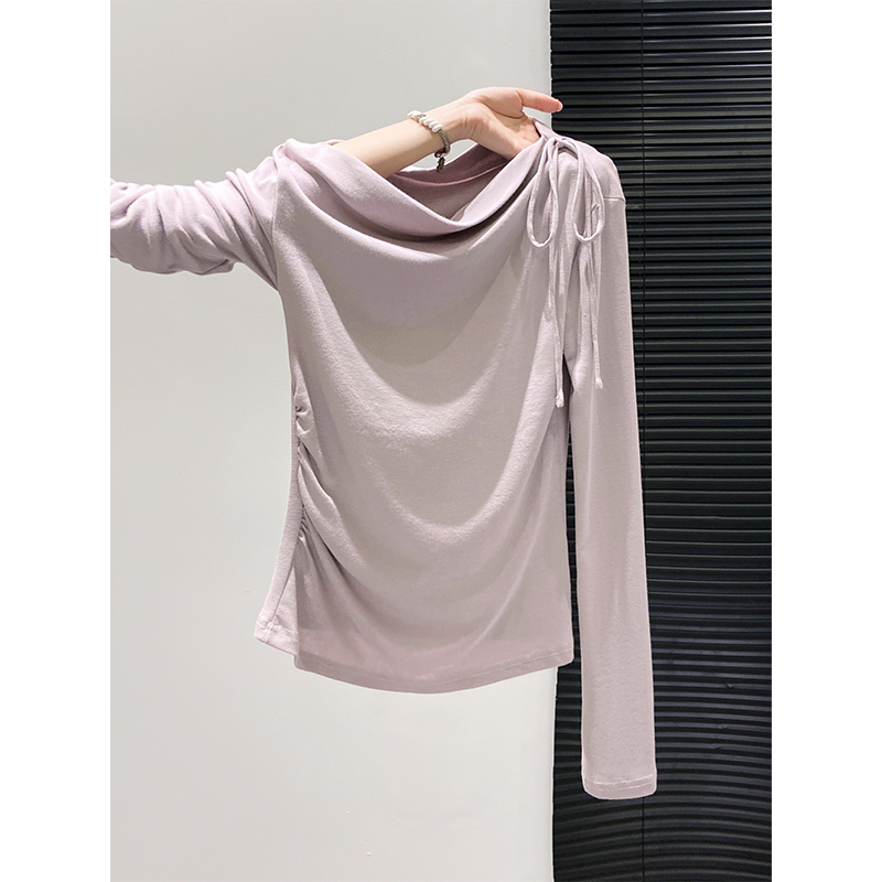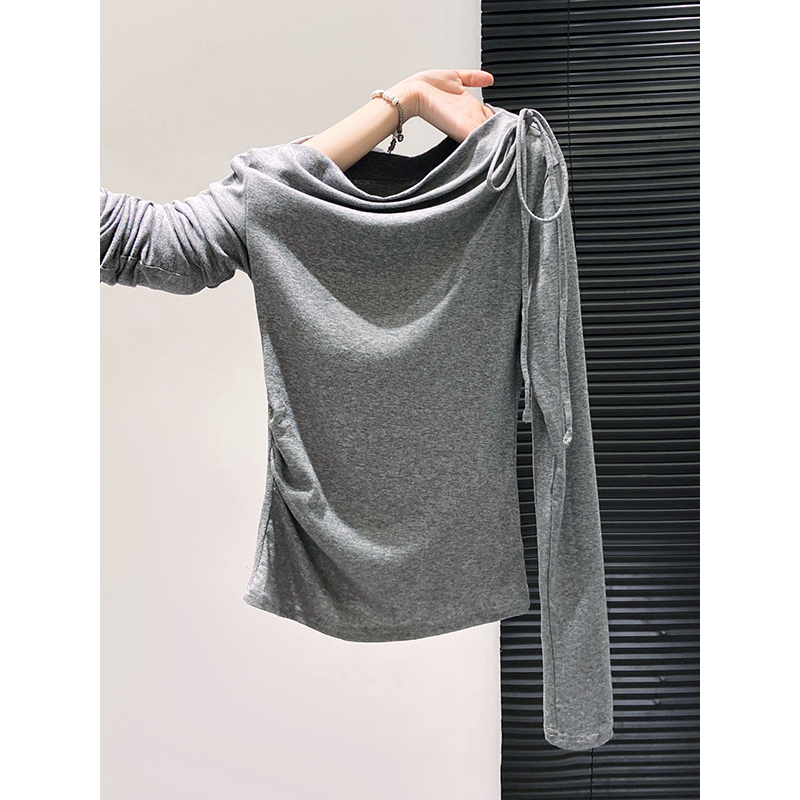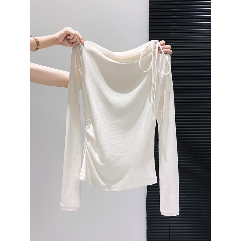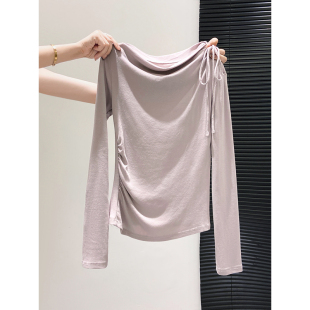 小上衣 褶皱收腰短款 纯欲高级感一字领绑带长袖 t恤女2025早秋新款