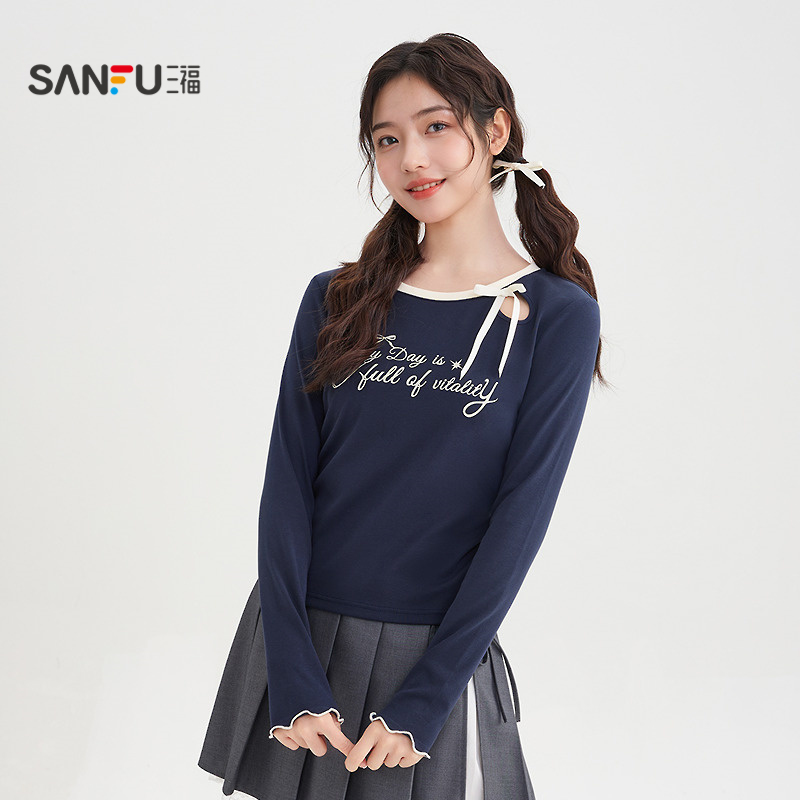 蝴蝶结镂空褶皱收腰圆领上衣女装 秋季 508623 T恤2025新款 三福长袖