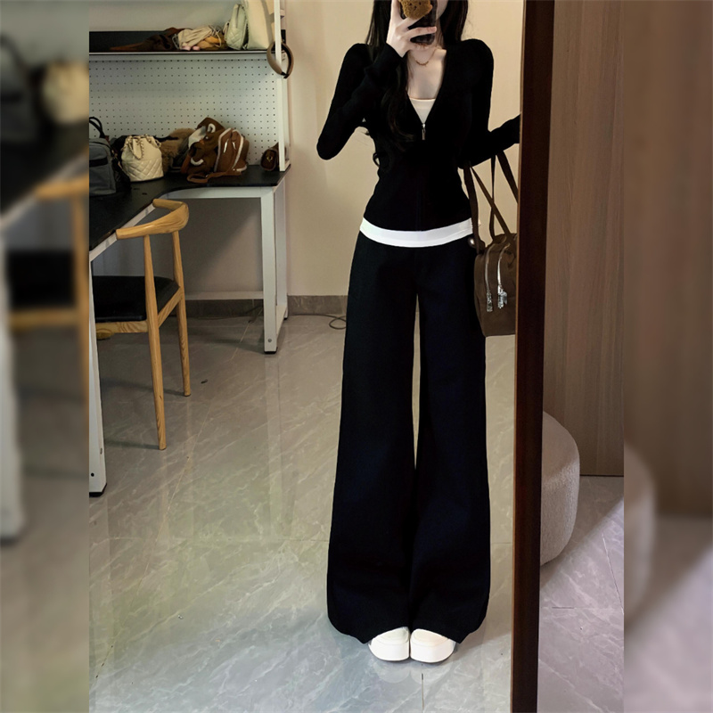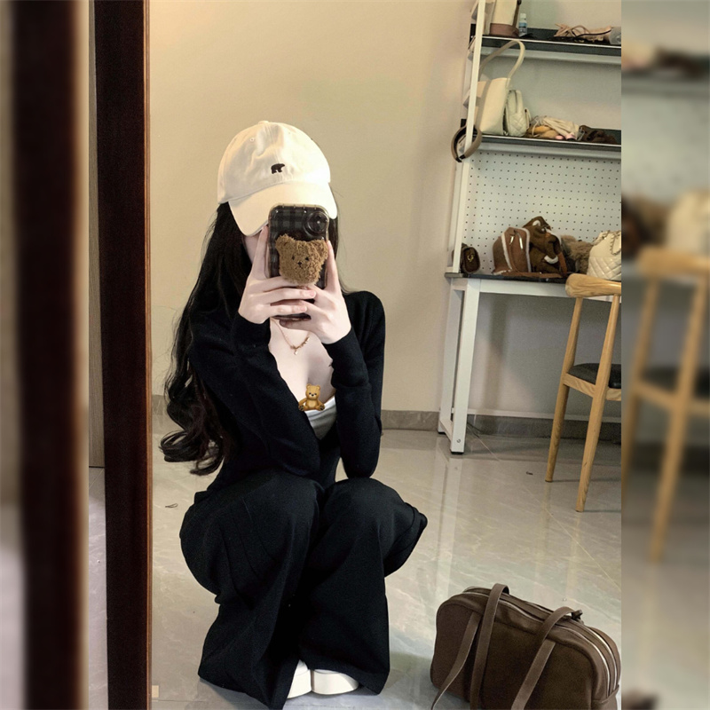 上衣内搭背心阔腿裤 辣妹风黑色休闲套装 长袖 修身 运动三件套 女秋季