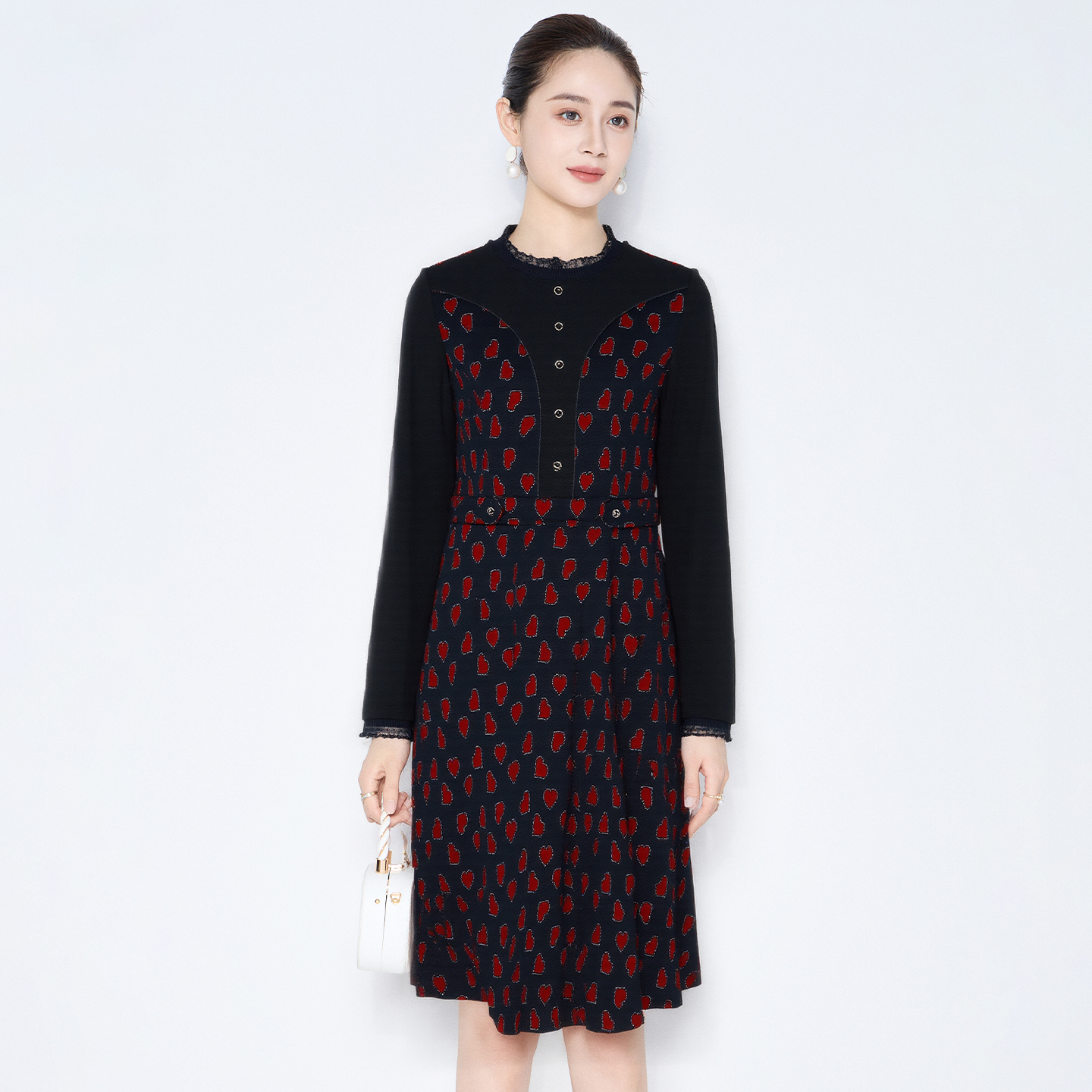 气质女装 马天奴2025秋冬新款 红色印花花边领连衣裙子拼接收腰长袖
