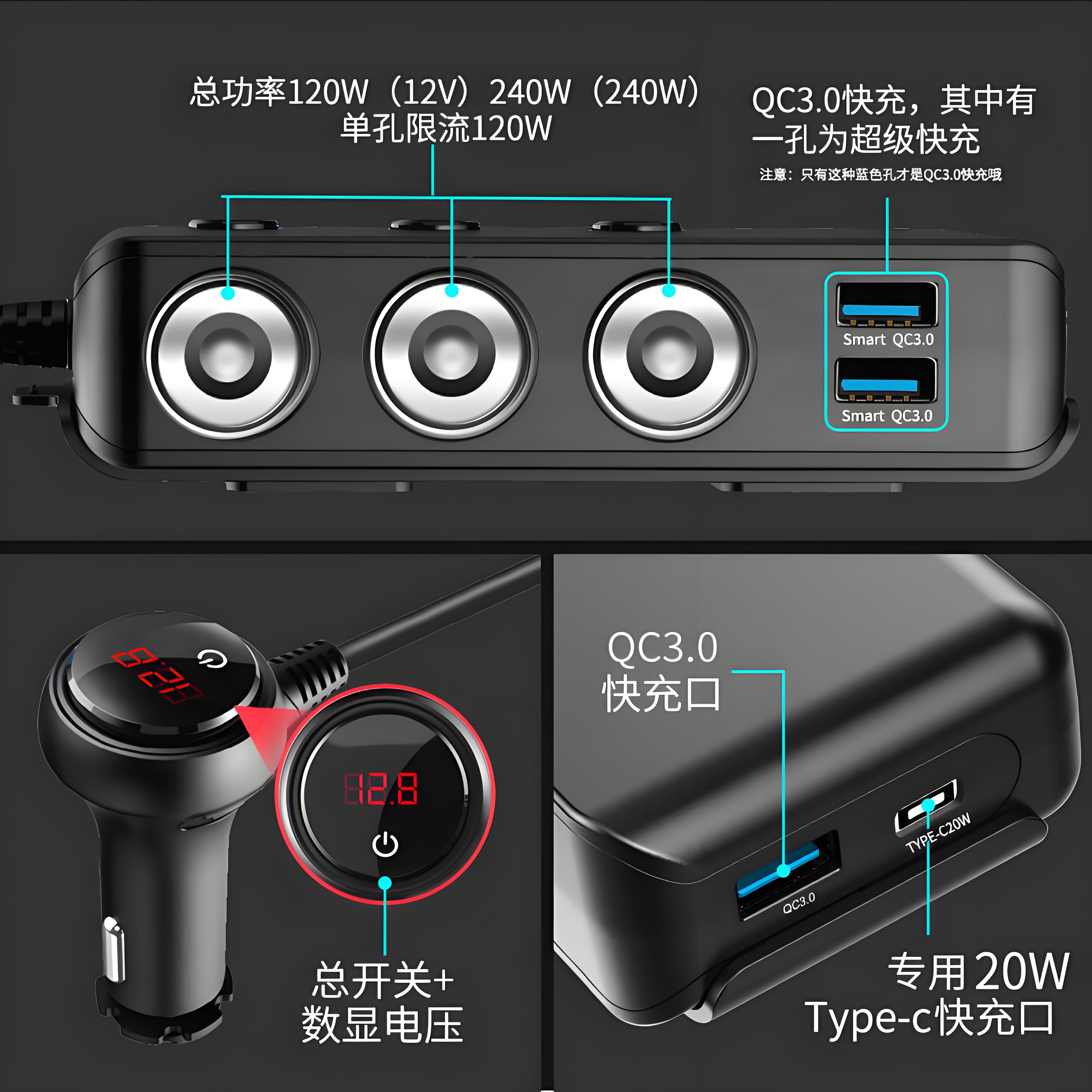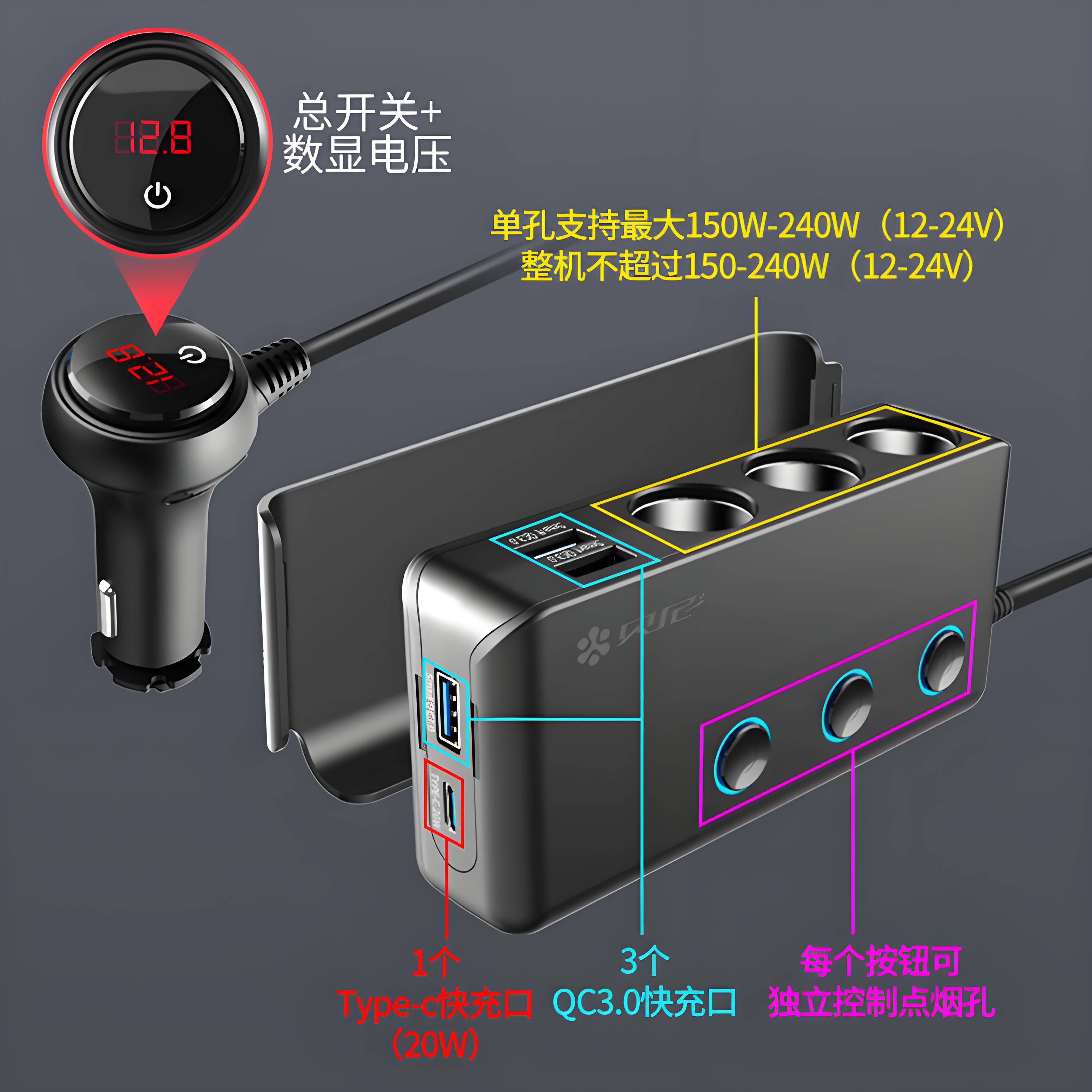汽车点烟器车载转换插头大功率车充电头一拖三车冲充电器扩展口