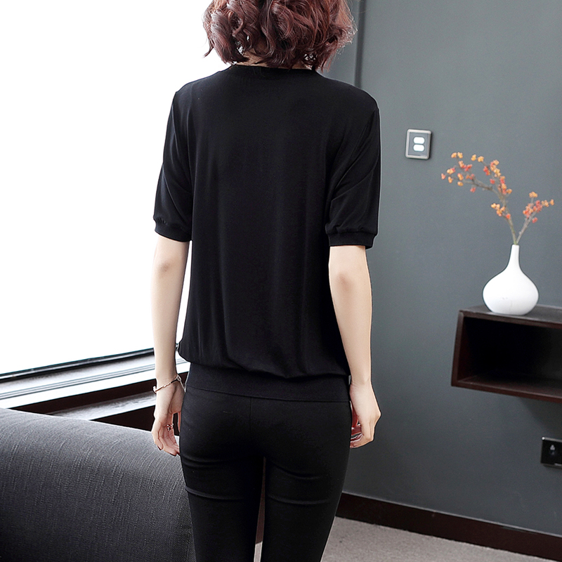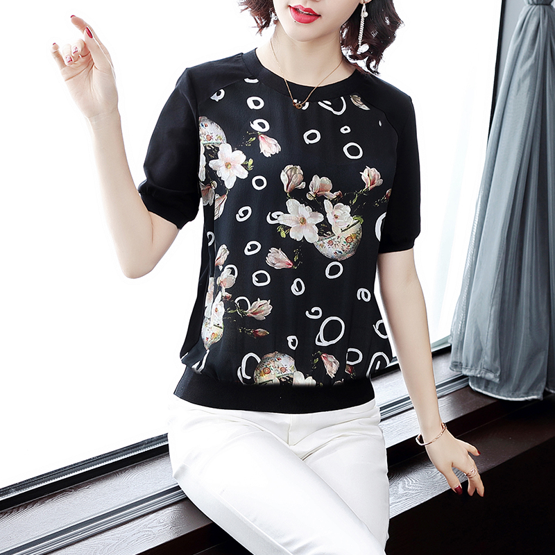 宽松显瘦气质衬衫 大码 印花黑色真丝上衣潮 t恤女2025春夏新款 短袖