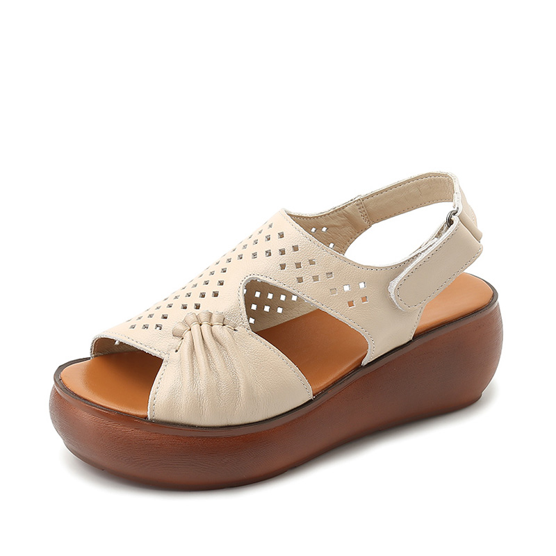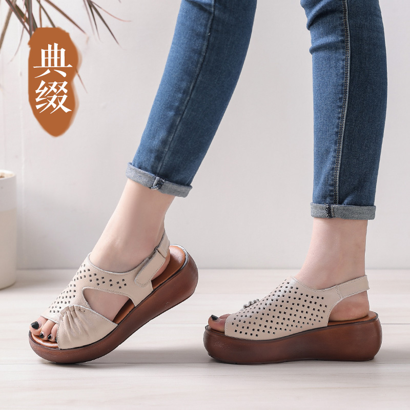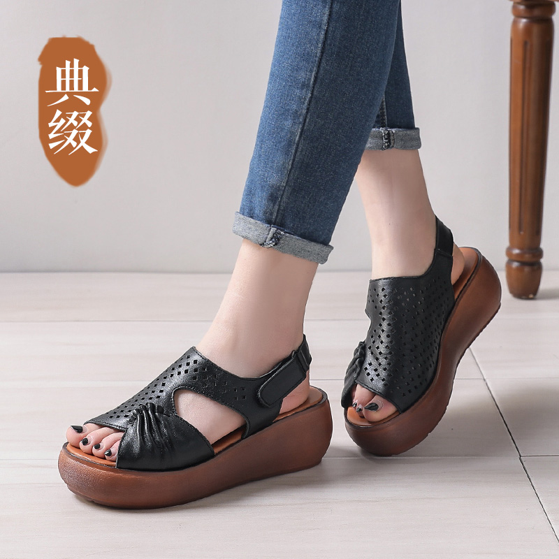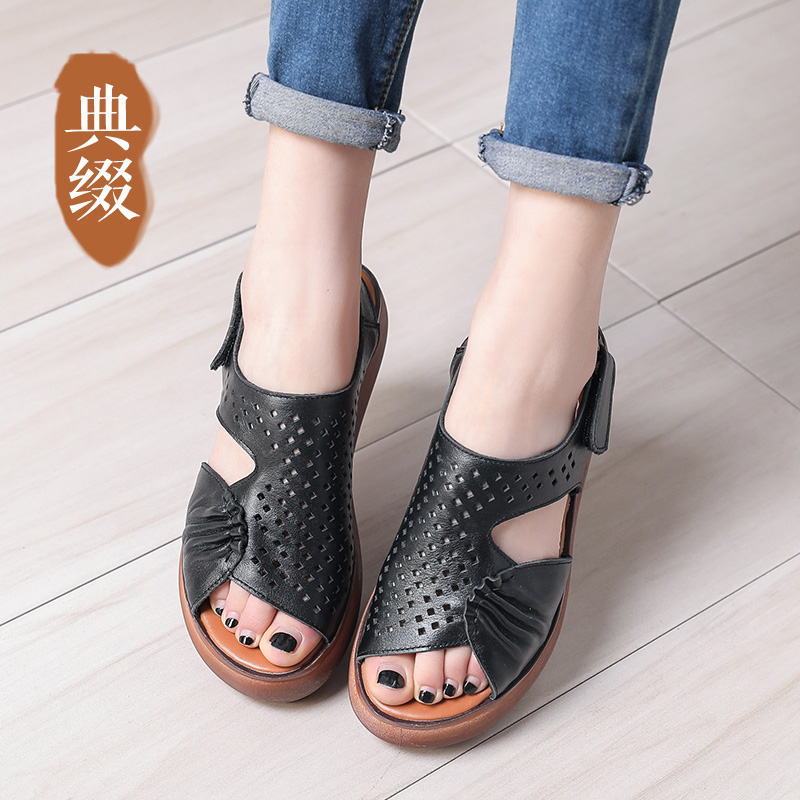 子女妈妈鞋 典缀新款 女魔术贴牛皮鞋 厚底软垫松糕镂空凉鞋 2025夏季