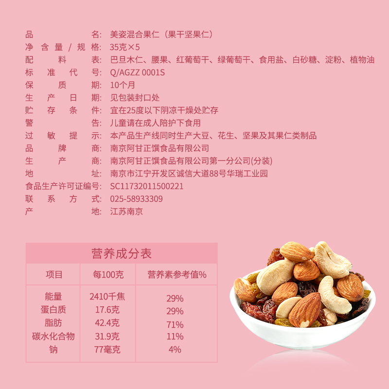 阿甘正馔混合每日坚果仁什锦休闲办公室零食干果小包炒货35g 5袋