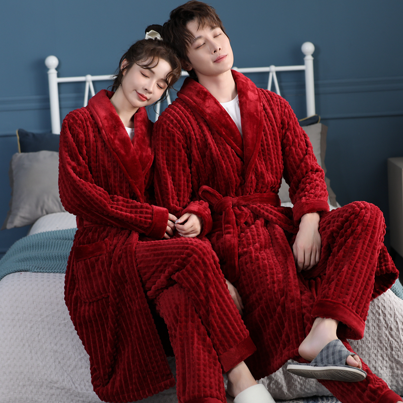 珊瑚绒长款 睡袍套装 女冬情侣睡衣加绒加厚伴娘浴袍结婚法兰绒男士