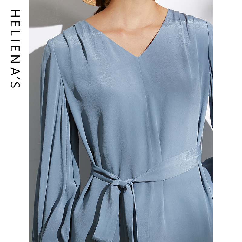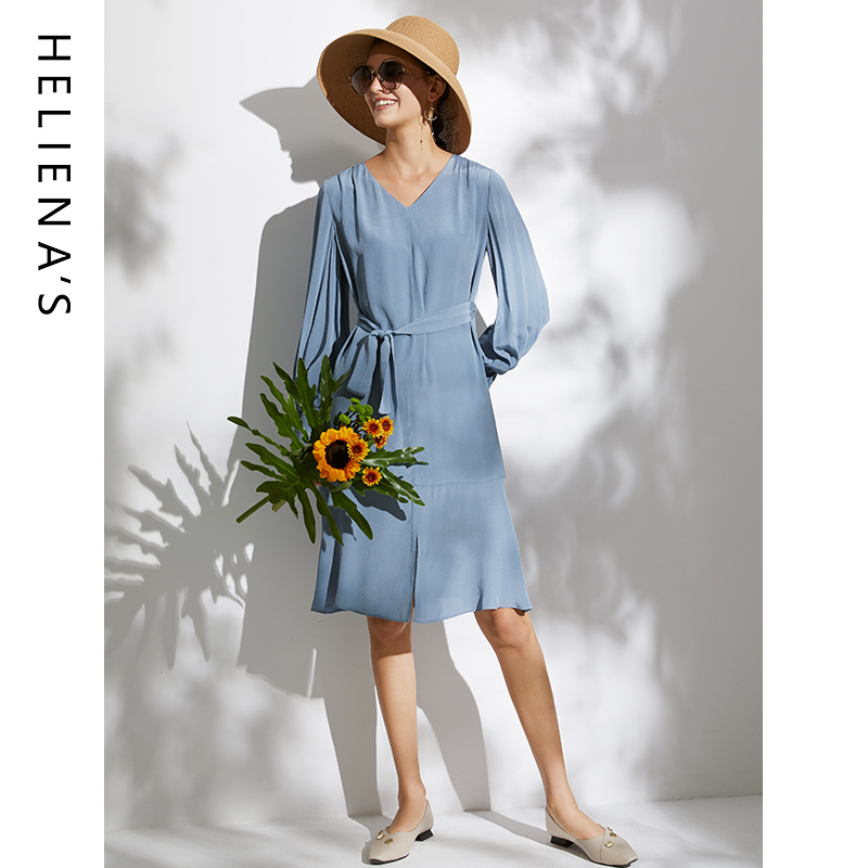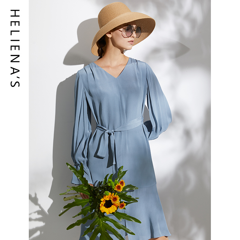 裙子V领蓝色连衣裙 气质收腰显瘦长袖 海兰丝2024早春新款 同款