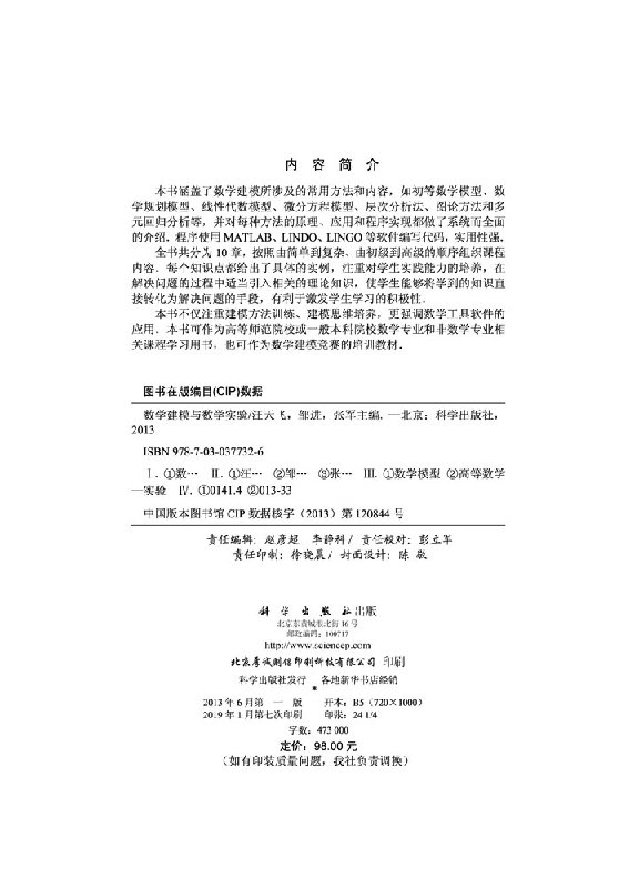 数学建模与数学实验 科学出版 汪天飞 张军 社 邹进 全新正版