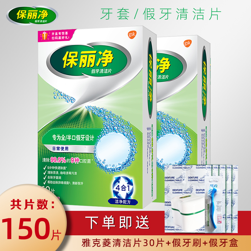 保丽净假牙清洁片150片 老年人全半口义齿消毒减菌泡腾片 刷盒