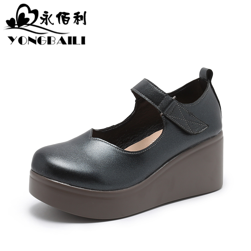 松糕鞋 2025春新款 女浅口圆头高跟真皮软底女鞋 羊皮单鞋 厚底皮鞋