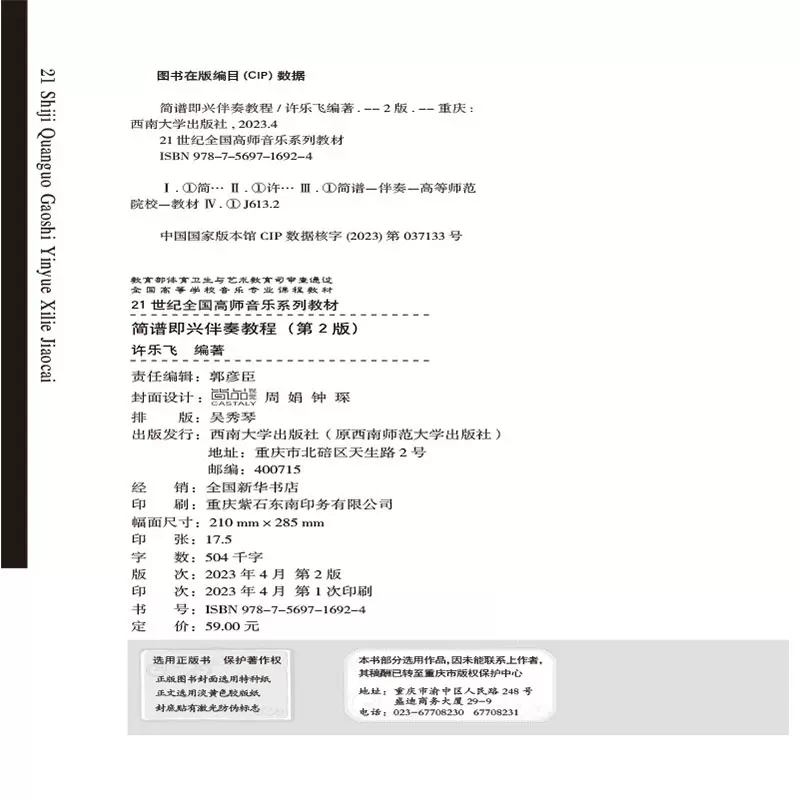 简谱即兴伴奏教程 许乐飞 21世纪全国高师音乐系列教材 西南师范 钢琴即兴伴奏曲谱 简谱流行钢琴即兴伴奏基础础练习曲教程书 正版