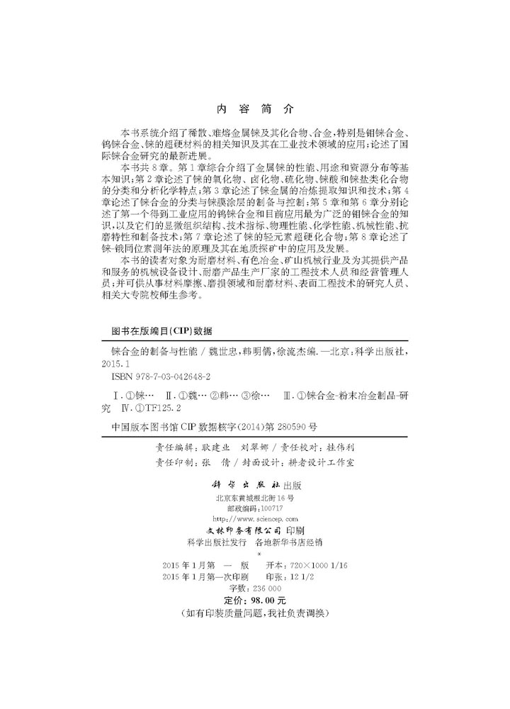 制备与性能 魏世忠 韩明儒 正版 科学出版 铼合金 徐流杰 社 现货