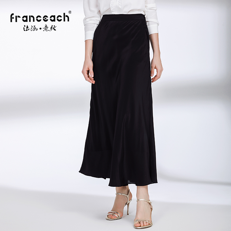 法涵意弛2025新款 黑色桑蚕丝大摆高腰a字长裙 真丝半身裙女中长款