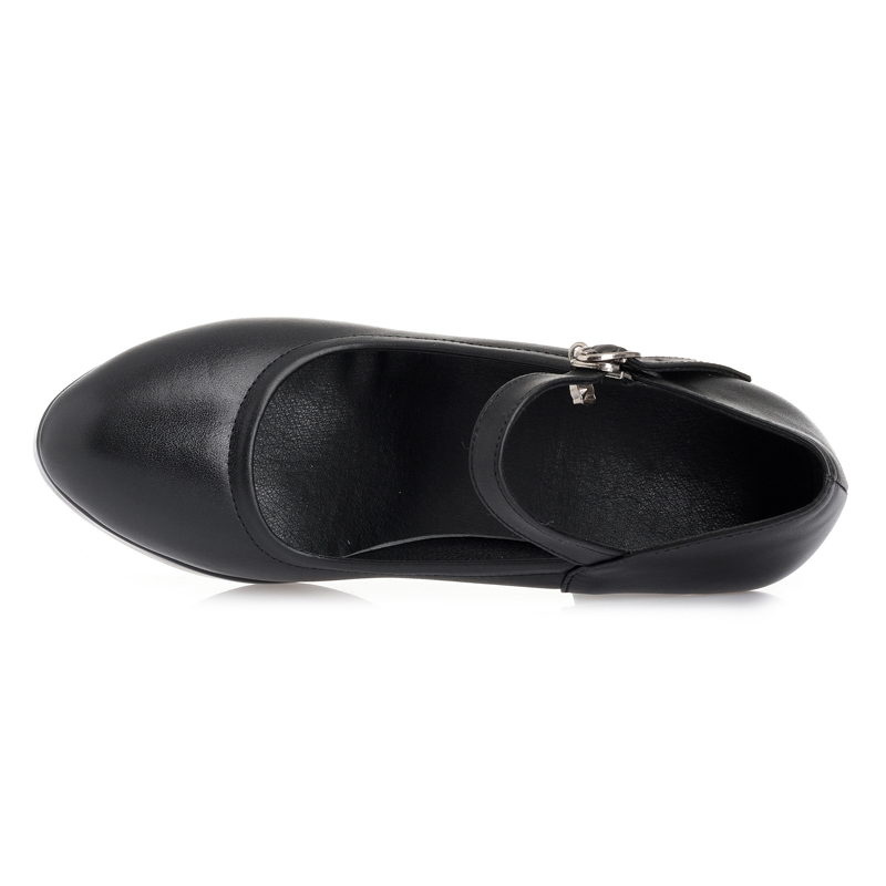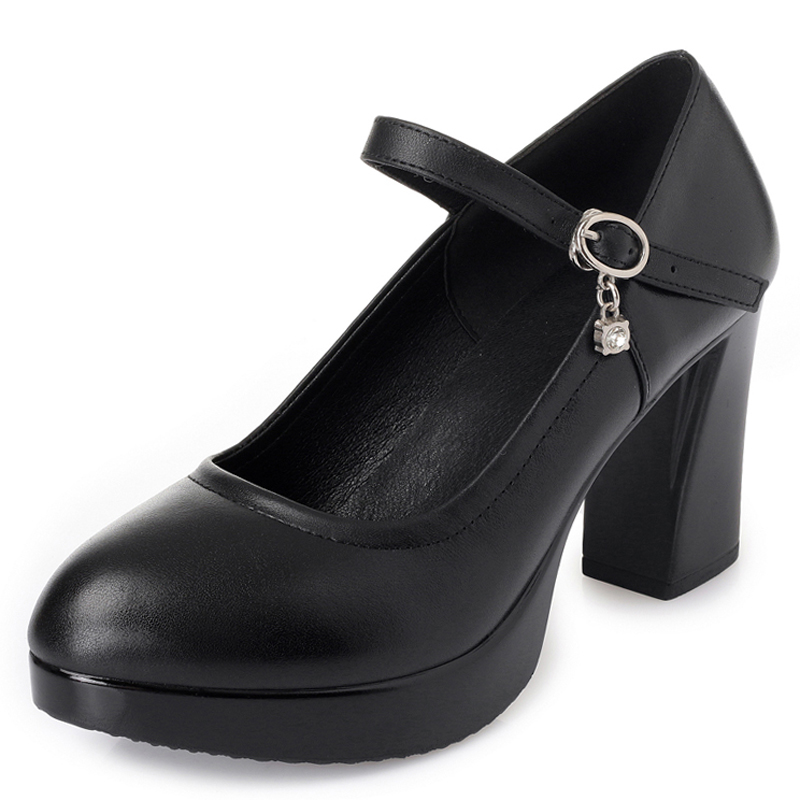 女鞋 粗跟女士软底皮鞋 女不累脚真皮黑色单鞋 一字扣软皮走秀高跟鞋