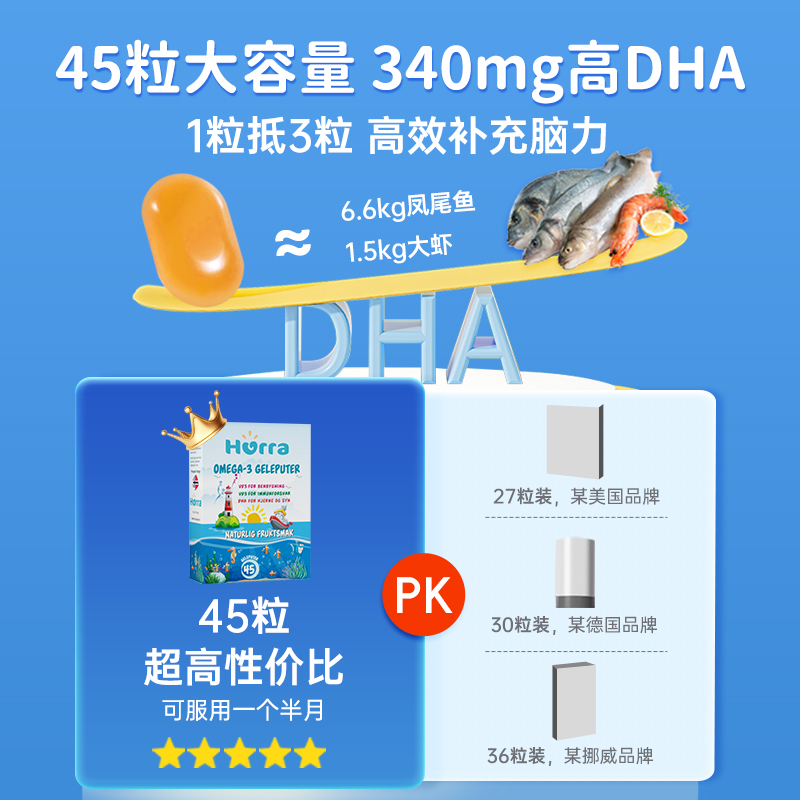 hurra挪威儿童dha好记忆鱼油宝宝青少年学习专注力维D3小布丁软糖