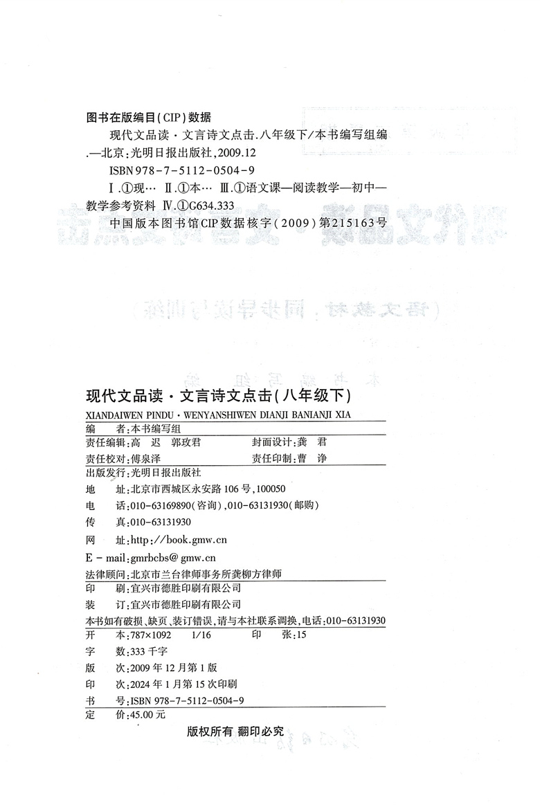 8年级下 附赠单元 光明日报出版 现代文品读文言诗文点击 社 不含答案 八年级第二学期 上海语文配套 2024年新版 测评