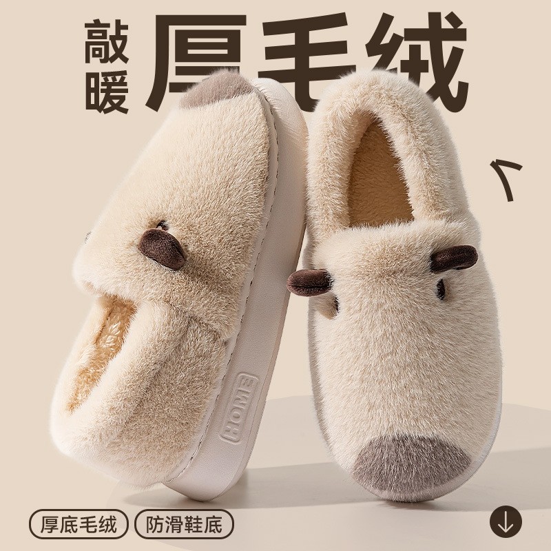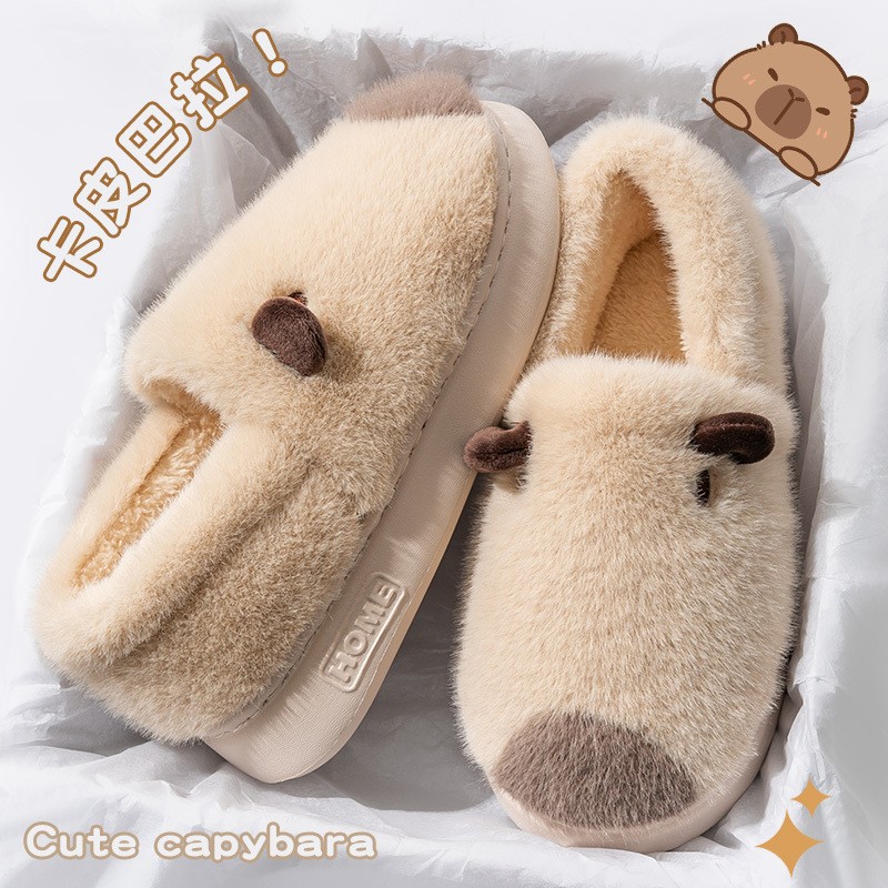 家居情侣保暖毛毛绒软底棉鞋 可爱卡皮巴拉包跟棉拖鞋 2025秋冬新款