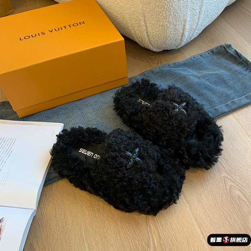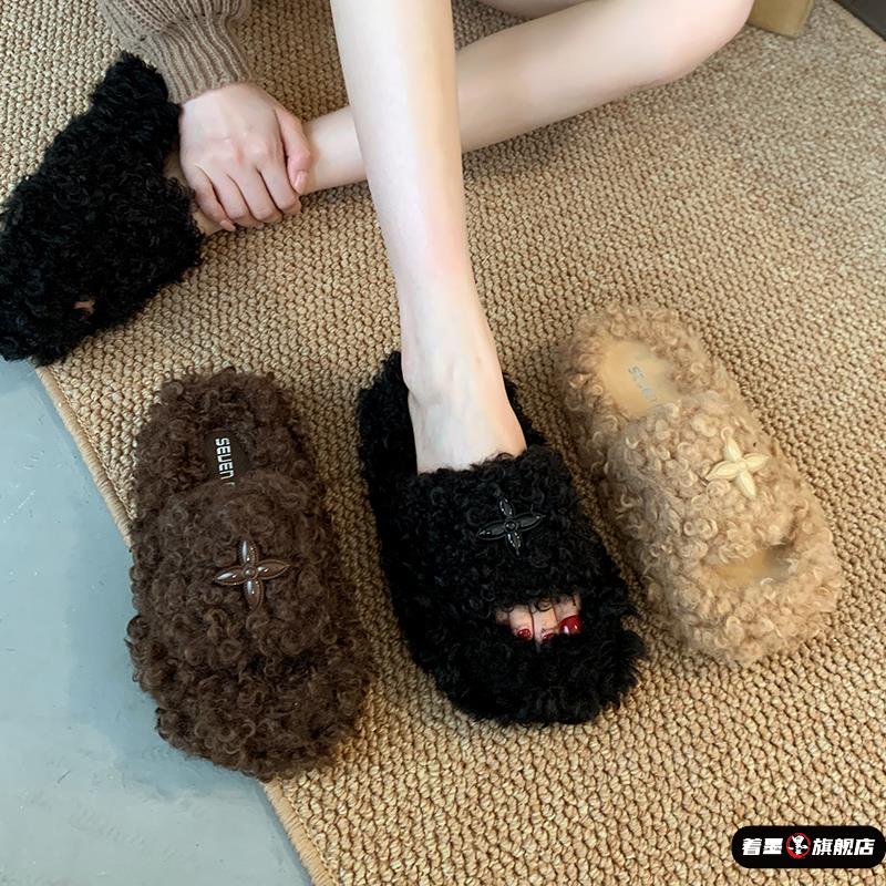 羊羔毛毛女秋冬2025年懒人一字棉鞋 外穿爆款 厚底增高毛绒拖鞋 冬季