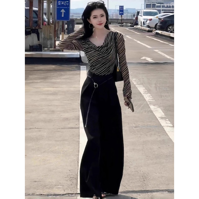 t恤阔腿裤 巨好看 气质斑马纹斜肩长袖 一整套韩系时尚 两件套 秋季