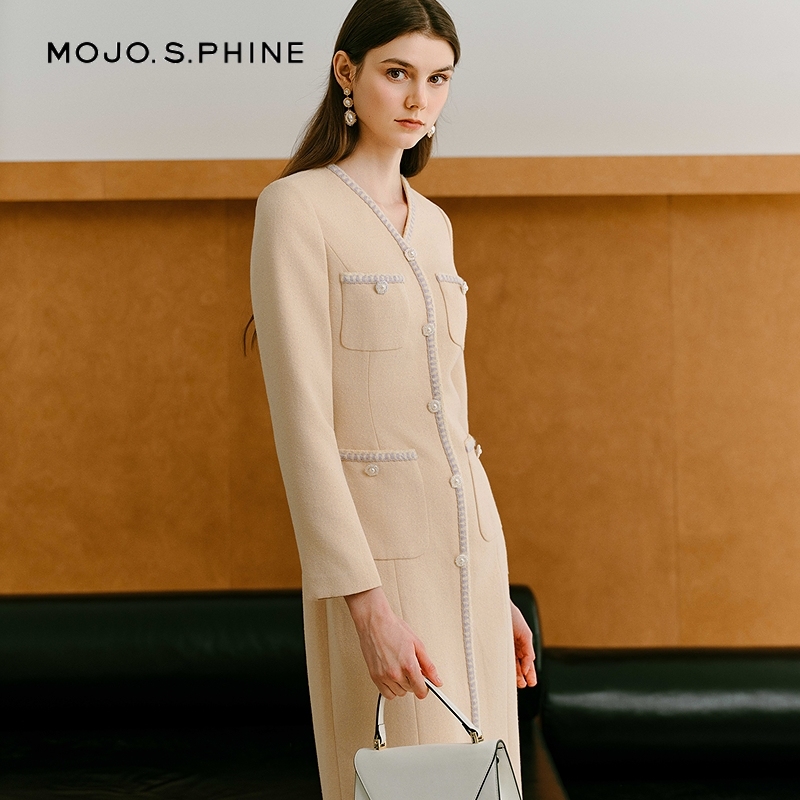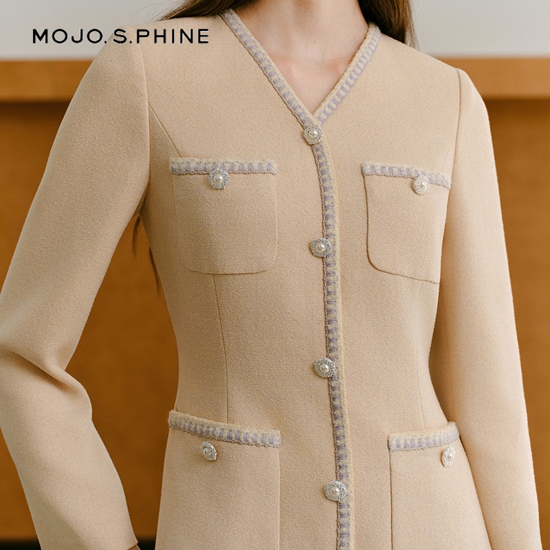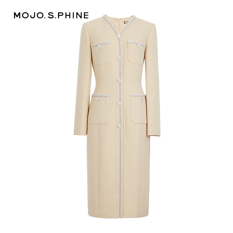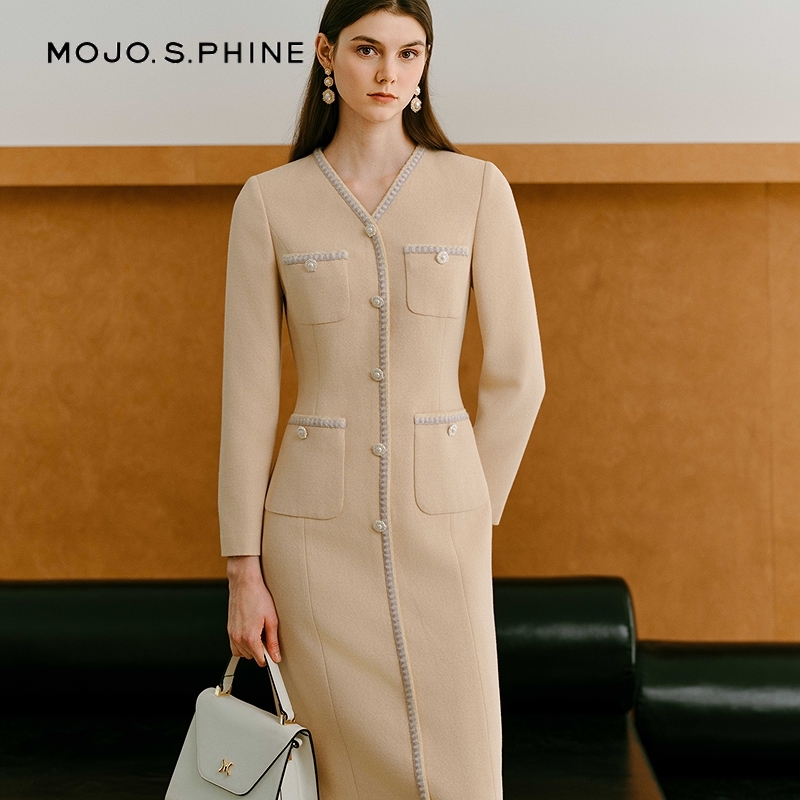 连衣裙女秋冬立体剪裁正肩V领长袖 MOJO莫佐2025新款 复古格调修身