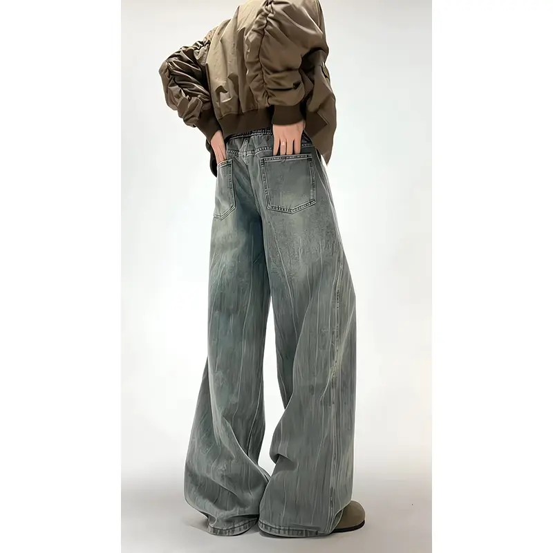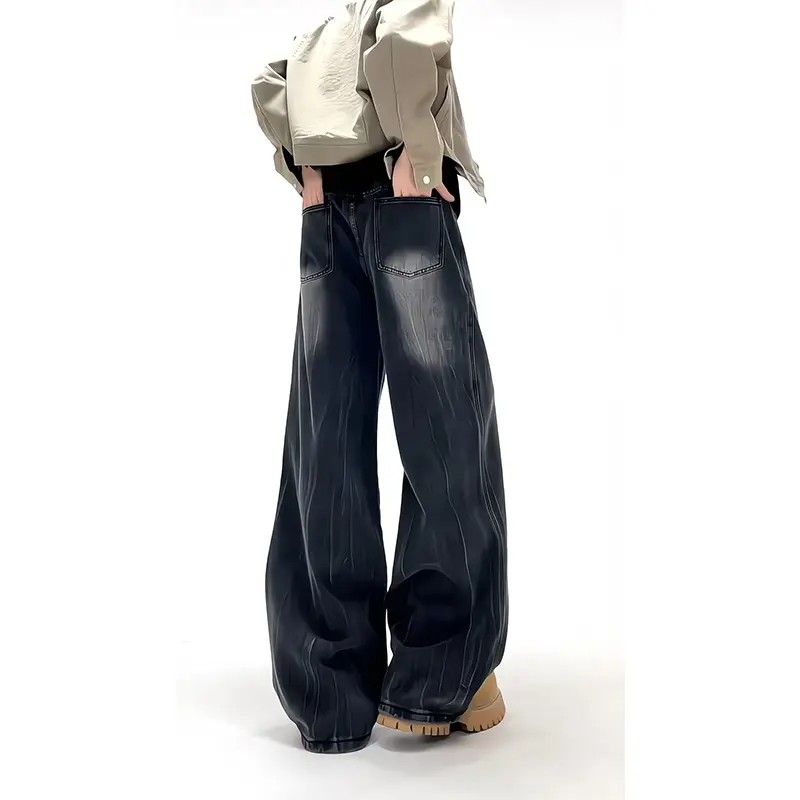 子 高腰显瘦垂感拖地直筒裤 淘稚气丹宁蓝宽松阔腿牛仔裤 女2025秋季